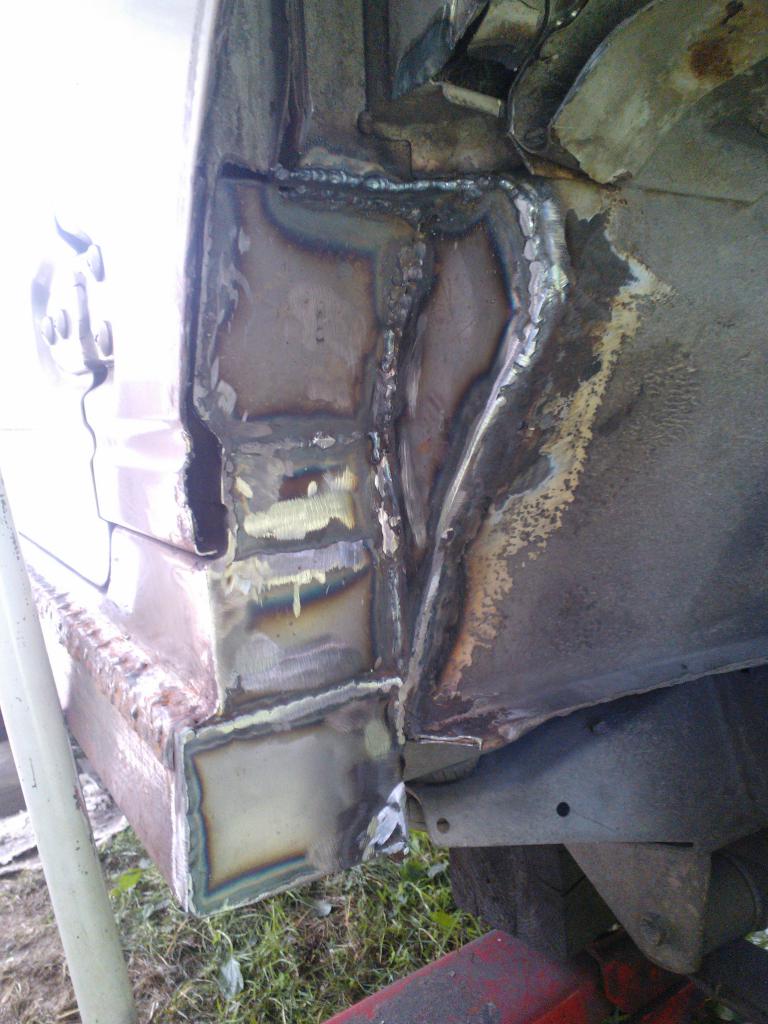 Isäukko tekaisikin kaaret taakse, jotka se lupaili laittaa paikoilleen (olikohan seuraavana päivänä), itse taas muistelin migillä hitsaamisen alkeilta ja turasin takakontin puolella onnettomia paikkoja. Seuraavana yönä kuitenkin ei nukuttanut, kun vaivasi juuri se, jos isäukolla hitsuutan tätä niin eihän sitä peiliin ilkeä kattoa. Niinpä aamulla kukonlaulun aikaan suoraan tallille ja eikun kaaria täppäilemään ja ihan minä ite. Siltä ne kyllä näyttävätkin, mutta harjoitus tekee......