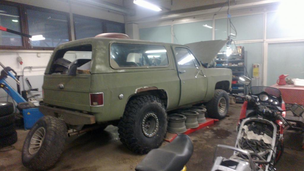 Chervolet "HIRVIÖ" Blazer -78Tuli pari kolme vuotta sitten hommattua tuollaine city maasturi. Tapaus on hieman ruosteinen Chervolet Blazer vm -78 5,7l bensakoneella mekaanisella ahtimella, muutenkin konetta hieman rakennettu ja muuten auton päällä kasvaa komeaa sammalta Keräsin muutaman vuoden motivaatiota ja nyt tänä syksynä iski kärpänen ja käytiin rakentamaan.... Olisi tarkoitus yrittää tehdä jonkunlainen offi auto. Aloitettu ihan perus jutuista olemassa olevan tekniikan kunnostuksesta vielä pari iltaa hitsata ja pääsis leimalle. Nyt valmiiksi tehtyjä asioita mm. Jakolaatikko korjattu ei pysynyt hidas puolipäällä (np203) Uudet hydraulinostajat laitettu. Weber kaasuttajan korjaus sarja / säätö...liekkö toimii vieläkään Bensatankki uusittu tuollainen 60l turvatankki saattaapi olla turhan pieni mutta mahtuuhan sinne toinen vierelle ja muutoinkin polttoainelinja uusittu pumppu,letkut,putket,suodin,paineen säädin jne. Virtapuolelle tuli laitettua tulpat, johdot, pyöriä, puola, kansi, jne... Ruoste vaurioita korjattu sieltä täältä niitä nimittäin löytyy samalla laitettiin palkki helmat. Pyäräkoteloita avarrettu reilusti eli runsaasti. Jarrut melkeimpä kokonaan uusittu....... Kaikki turhaan. Takavinssi 12t kg Stereot. Ja tietysti uusi akku ja valojen korjaus ynm. Jotain varmasti unohtui mutta siinä pää sääntöisesti Laittoa odottaa hallin nurkassa 14,5x42" irokit ja mallia oma valmiste lukkovanteiden osia kasaamatta/osittain hitsaamatta. Volvon portaali akselit 7.55välityksellä, tojotan levyjarruilla ja 6x pultin jaolla Etuvinssi 12t kg eli samanlainen mitä laitoin taakse. Laa-puhelin. 180 ah akku joka pitäisi sijoitta auton taka osaan Tilattuna Olikohan se joku shake flip vai mikä lie hässäkkä jolla käännetään taka lehtijousien riipukkeet alaspäin. Valoja läjä tupla nivel kardaanin nivelet loput niihin tehdään itse. Jostain pitäisi vielä löytää suburbanin taka lehti jouset niin voisi nuo takana olemassa olevat siirtää eteen. Koitan laittaa tänne kuvia hirviön rakentamisesta kunhan opin käyttämään tätä vehjettä