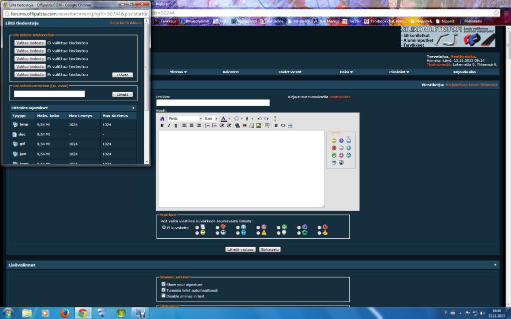Eli klikkaat ylhäällä näkyvän hymiön vierestä ton paperiliittimen (klemmarin) kuvaa ja siitä pitäisis aueta ton näköinen näkymä, kuin mulla liitteenä.
