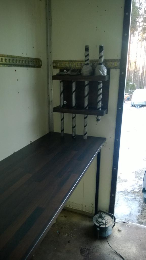 Ja pienenä omituisena yksityiskohtana tuli tekastua pöydän kanteen reiät jotta vetarit mahtuu tuossa telineessä olemaan ![]() Tuon pöydän viereen tulee sitten tällanen, sekin kiinni pultattuna. Tuonne menee sitten pienet varaosat, tarvikkeet ja työkalut mitä kulkee aina mukana. Pöydän alle pitänee pultata jonkinlaista säilytystilaa myös... Jos tekis Jerryille telineen sinne + kannellinen laatikko isommille rojuille? Jossain vaiheessa sitten varmaan pitää keksiä jotain säilytystiloja tuon pöydän päälle seinälle, mutta se saa vielä odottaa että keksii mitä fiksua sen kans keksii. Niin ja se ruuvipenkki tuohon pöytään. Kesemmällä pitää rakentaa varustelaatikot uusiks ja hommata aggregaatti sinne, pakkohan se on kun se lukee oikein otteessa ![]() Sitten kun tuo aggre on hommattu vois yhden kompuroista siirtää pysyvästi konttiin niin ei tartte minikompuralla renkaita enää täytellä riippumatta siitä onko verkkovirtaa lähellä vai ei. |