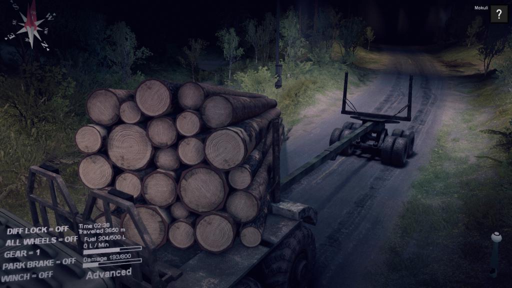 Iski vaan uus paniikki kun määränpäässä sain tukit kyytiin mutta tuntematon reitti valinta johti montuun josta ei pääse ylös ja peruuttaessa vetää tukkikärryn linkkuun... polttoainettakin on vaan puolitankkia jäljellä...