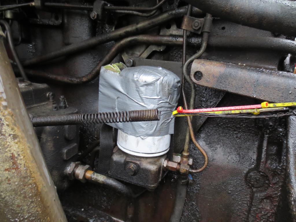 Viikonloppu tietysti, mistään ei mitään saa.. Suodattimen kierteet siis korkkas lähes kokonaan.. Mutta tällänen patentti sitten tehtiin, eli pienellä liinalla suodatin jalkaan kiinni ja vielä teippiä päälle varmistamaan että liina kestää päällä