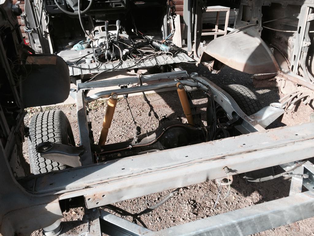 Päivitelläämpäs tätä, vaikkei ihmeitä ole tapahtunut. Runko on jälleen omilla pyörillä kun alustasarja paikoillaan. Seuraavaksi jarrujen kimppuun, ja sitten se moottori. Alkaa tuntua siltä että menee entisöinnin puolelle, mutta tehdään sitten näin kun aloitettiin. Puuttuvat osat löytyneet sieltä sun täältä, ainoa mikä puuttuu on öljypohja. Käykö 60:sen pohja 61:een? Pari kuvaa: