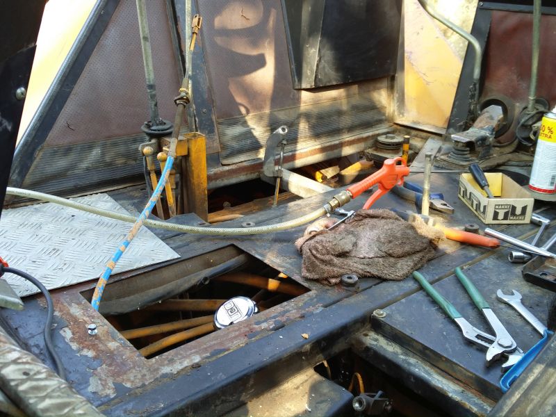 Homma alko tuolin irroituksella ja hytin tyhjennyksellä. Kun lattialevyjä sai auki niin sieltähän paljastui linnunpesä. Remontti viivästynyt siksi, että varaosakauppias toimitti ensin väärän vaijerin. No ei tämä oikeakaan ollut ihan 1:1 käypänen. Piti purkaa osia pois ja vähän säveltää jotta sopi ja sisukset liikkui oikein. Uudessa vaijerissa alapään kierre näytti tuntemattomalta (muttereita ei ollu mukana). Osoittautui 12X1.5 kierteeksi. Ei auttanu muuta kun vääntää hätäpaska eli normaali 1.75 nousun mutteriin raakasti uudet kierteet ja rock&roll jatku. Tämäkin kuten kaikki muutkin hommat tässä koneessa tapahtuu persläven kautta. Kädessä pitäisi olla pari niveltä lisää jotta homma sujuisi. No lopulta koneessa käsijarru ja lattia kasassa. Huommiseksi jää vielä hytin muu kasaus. |
