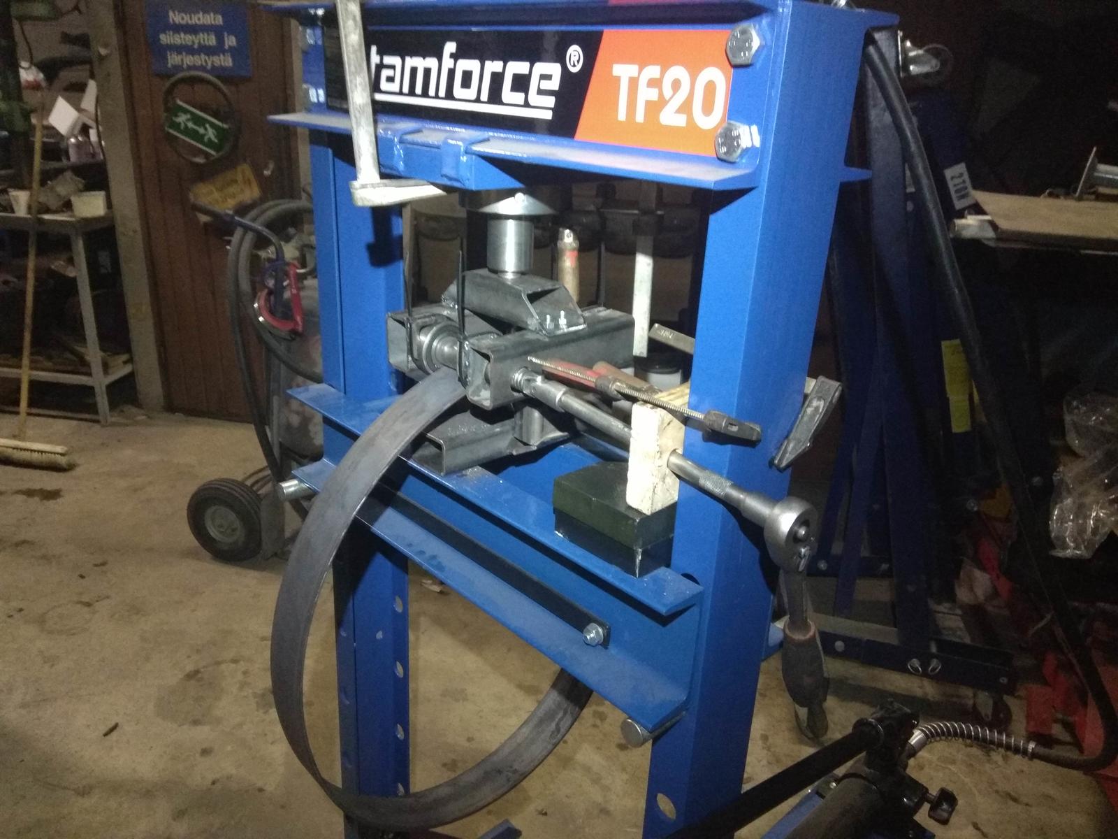 Kun kaikki pitää tehä ite... Prässiin mankeli jolla saa 5x60 latat pyöräytettyä vanteisiin levikkeeksi. 6kpl laakereita á 3,90e, 30mm akselia kolme pätkää ja putket työpaikan jämäpaloja. Laakerit kiinni kulmaraudan pätkissä nippusiteillä ja yhteen akseliin hitsattu hylsy josta saa räikällä mankeloitua. Ja hyvin toimii