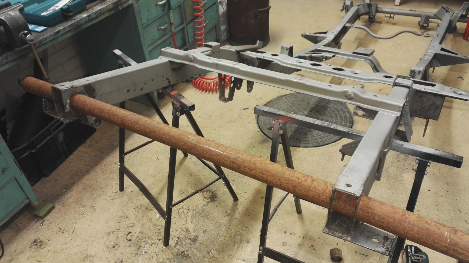 Tilasin 3mm seinämäistä palkkia 60x100 koossa. Taisi tulla 60x120 4mm seinällä. Kohtuu jäsyä tavaraa sai nostella kylkiin. Jälleen nylon naru ja Nasaretin teippi piti yhdistelmän kasassa omien käsien (2kpl) loppuessa kesken. Hitsasin palkit kiinni ylipitkänä edestä ja takaa, sillä ajatuksella, että en vielä tiennyt miten paljon renkaat vaativat tilaa ja hitsaanko palkin päät mahdollisesti umpeen (en hitsannut). Myöskin se miten poskipalat asettuvat palkin kanssa vaikuttaisi. Ja lähtisikö palkeista suoraan tuet mahdolliselle kattotelineelle.