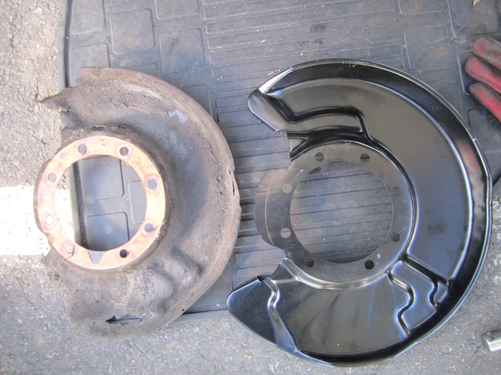 Keskikuppi irti ja 6kpl pienet mutterit auki, pari kertaa vasaralla kopan kylkeen ja kiilat irtosivat. Koppa pois, ison mutterin lukkohakaset auki. Iso keskimutteri olikin "auki" eli käsin avattavissa, samoin sisempi (!?). Liekö jäänyt löysälle tai löystynyt matkalla. Punaista vaseliinia käytetty ed. rempassa. 30v vanha j-kilpi pois ja uusi tilalle. Pah, j-sylinteri ei mahdu paikoilleen. Rälläkällä peltiä pois kolmesta kohtaa (merkattu piikillä) ja sit sopi. Aikaa meni 2h eka puoli ja toinen 1h, kun siinä välillä sauhutteli, rällköi, mittasi ja haki työkaluja varastosta.