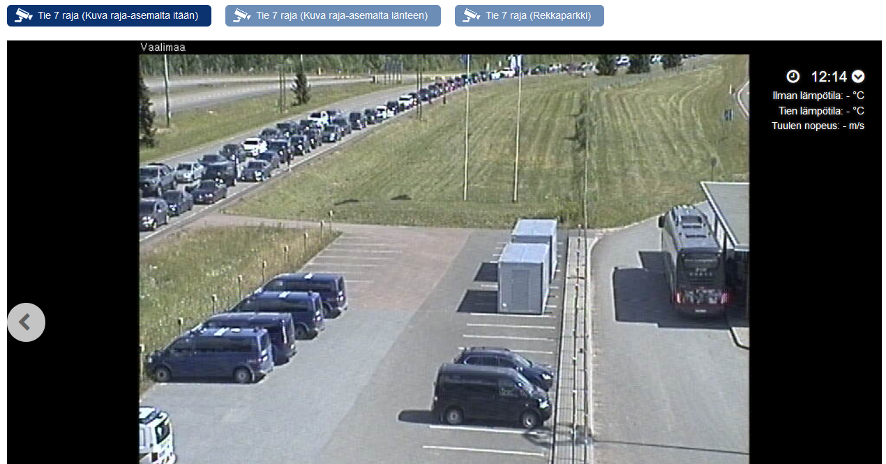 Ei ole vielä ruuhkia: https://www.kelikamerat.info/kelikam...ala_raja_Suomi https://www.kelikamerat.info/kelikam...a_RYP_saapuva2 https://www.kelikamerat.info/kelikam...e-7/Vaalimaa_3 Mutta toveria pukkaa kyllä: https://www.kelikamerat.info/kelikam..._Vaalimaa_raja |