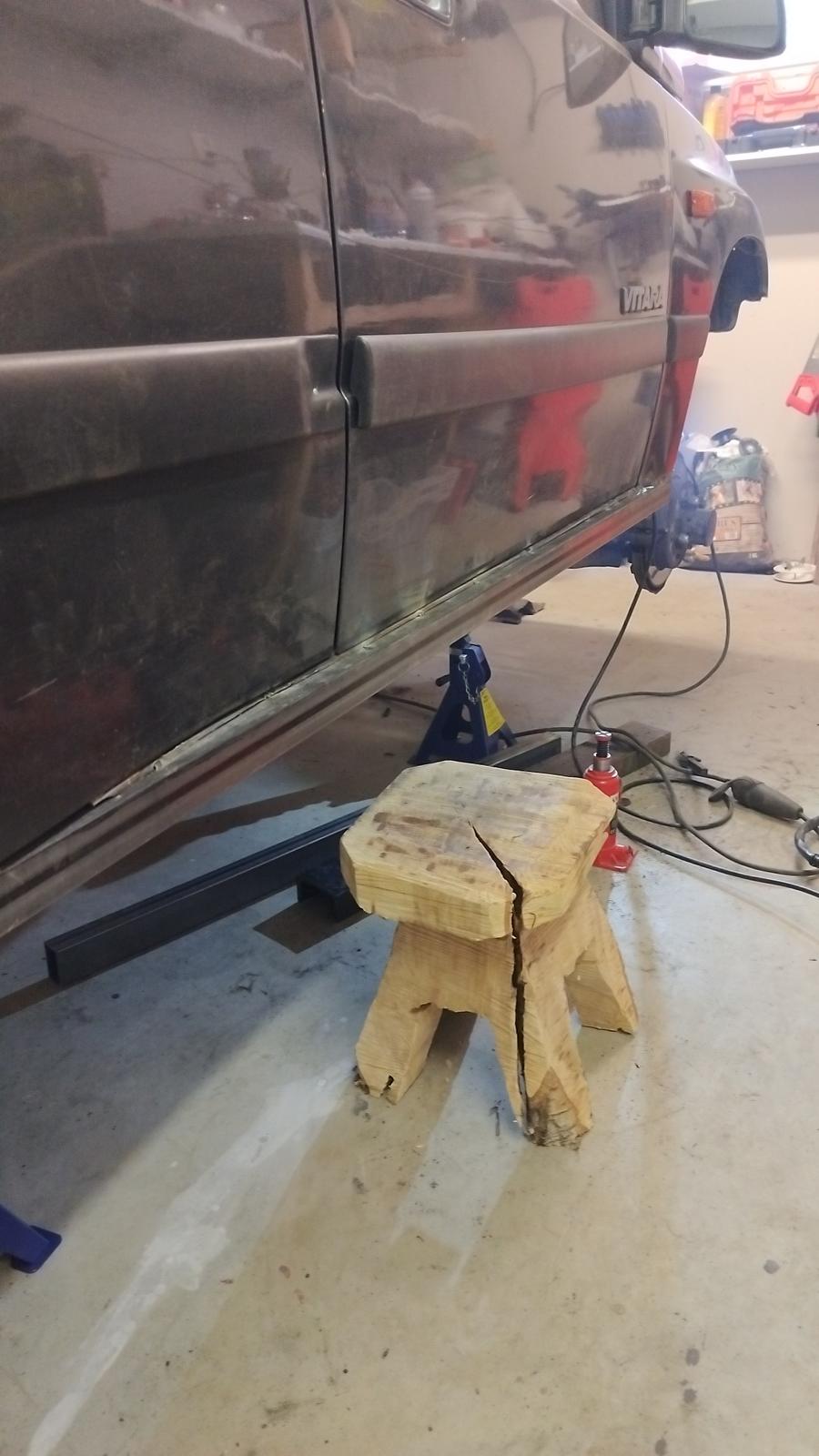 Kyllä tuo uretaani oli jonkun korjauksen yhteydessä sinne laitettu, mutta nyt ne on pois. Vänkärin puolelta joutui näemmä vähän isommasti ottamaan vanhaa peltiä pois ja joutuu tekemään uudestaan tuon paikan mihin tulee tuki runkoon.