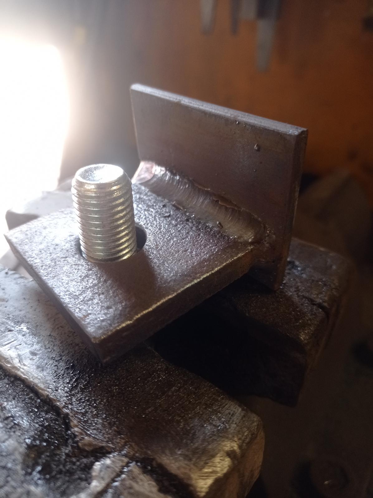 Alunperin koukun runko on kiinni kuudella M10 pultilla. Keskellä neljä läpipulttia ja oikealla reunalla on kaksi, ei, läpipulttia. Lisäsin myös vasempaan reunaan vastaavanlaiset kaksi pulttia, eli nyt se on kahdeksalla pultilla kiinni. Lisäsin ne kaksi lisäpulttia niin että leikkasin auki, hitsasin reikien taakse mutterit ja hitsasin irti leikatun palan takas kiinni. Nuo kaksi levyä tulee vielä kiinni toisiinsa levyllä, joka hitsataan tuohon alapuolelle. Siihen alapuolelle tulevaan levyyn tulee sitten todennäköisesti kiinni koukun pikakiinnityksen naaras-osa.