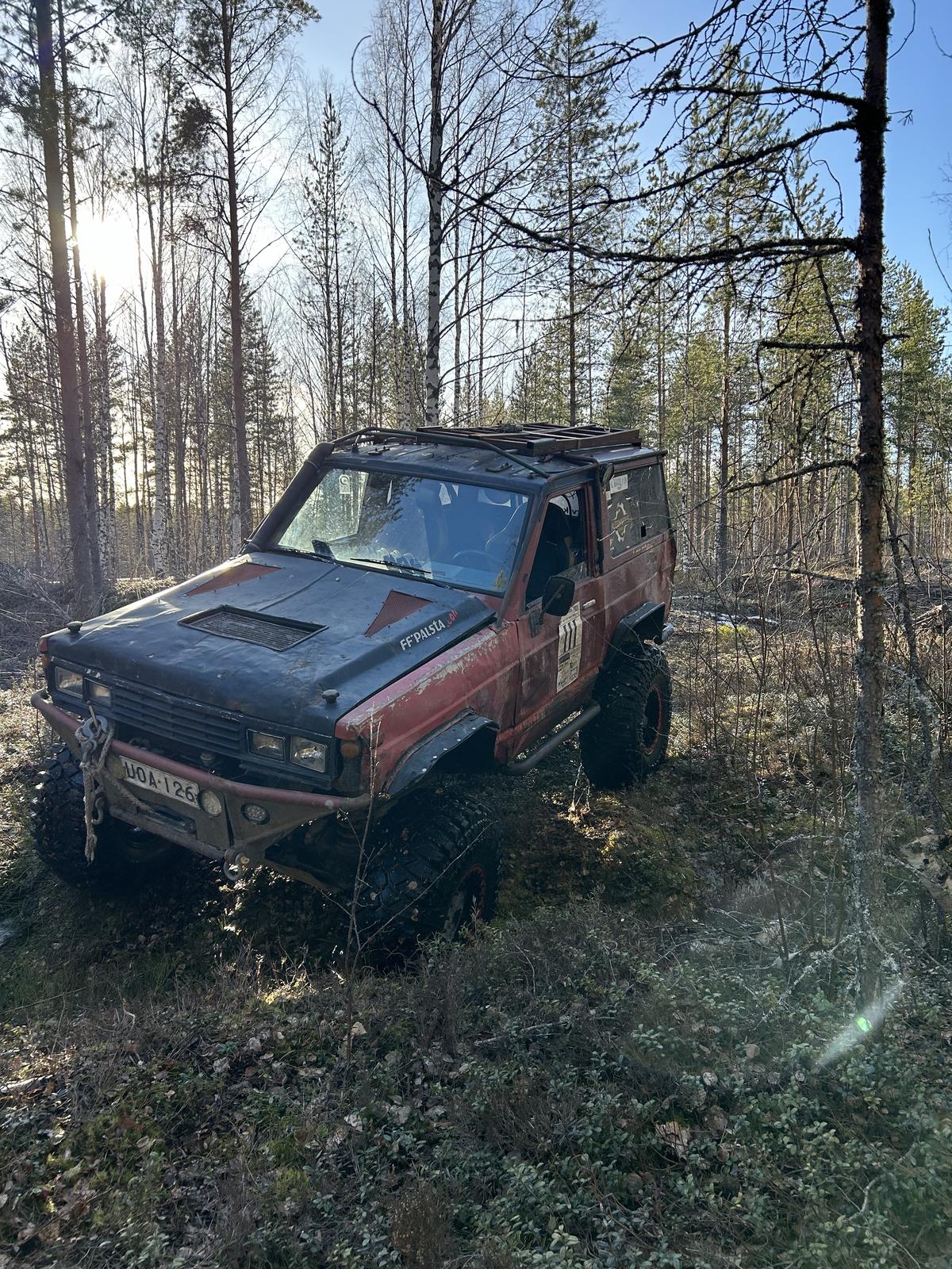 Musta pelaa ja liikkuu niin saa väistyä näpräilyltä vähäksi aikaa. Portaalia sais ruveta laitteleen edellisten ajojen jäljiltä… takaovi korjata kun nyt liinalla kiinni. Vaihtaa uutta peltiä eli lokasuojat, ovet ja takanurkat oikoa tai tehdä kokonaan uudestaan. Helmaan/takapyörän koteloon tuli nyrkin kokoinen reikä Asis suunistuksessa.