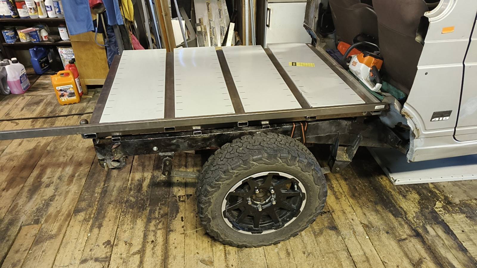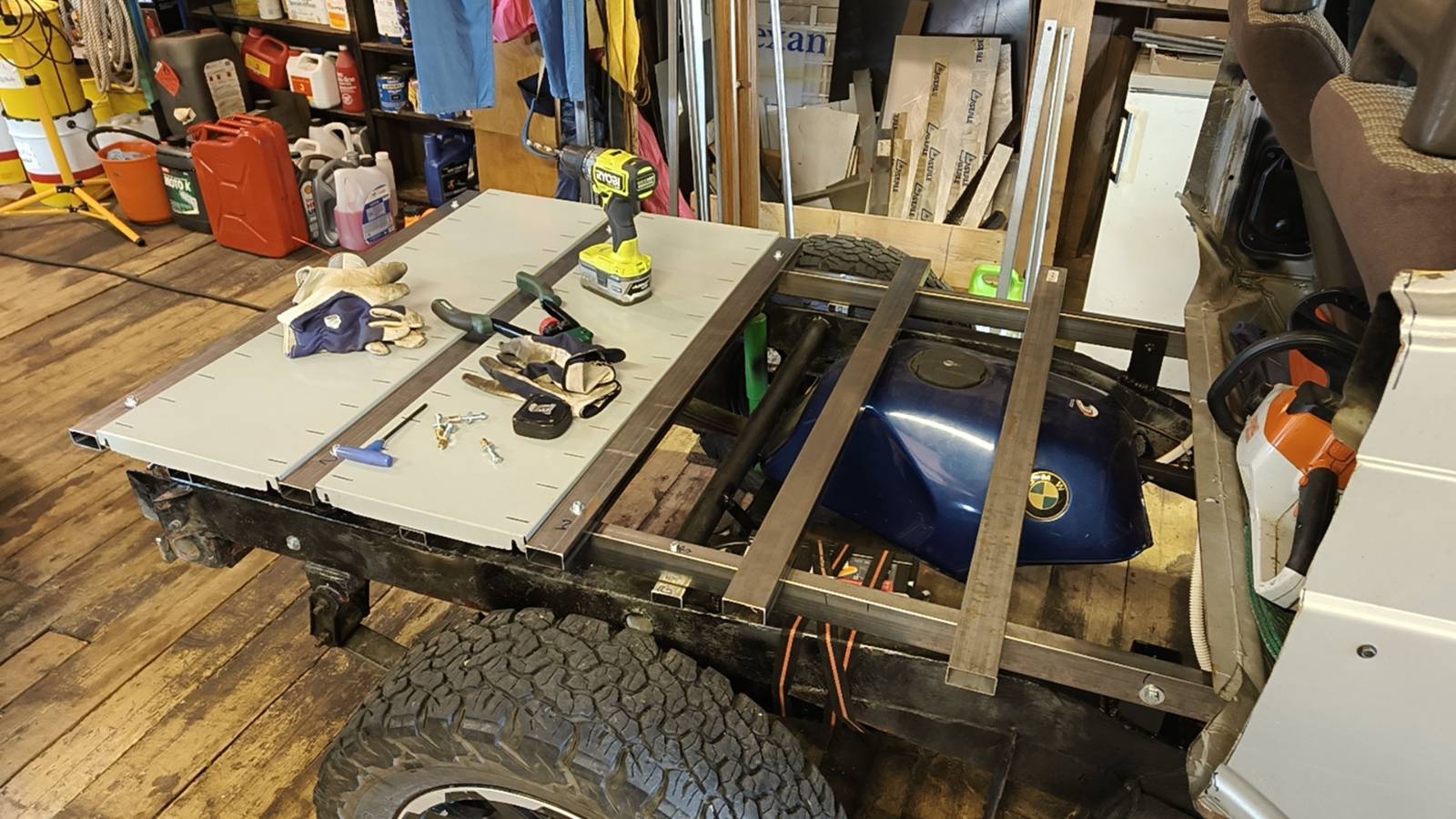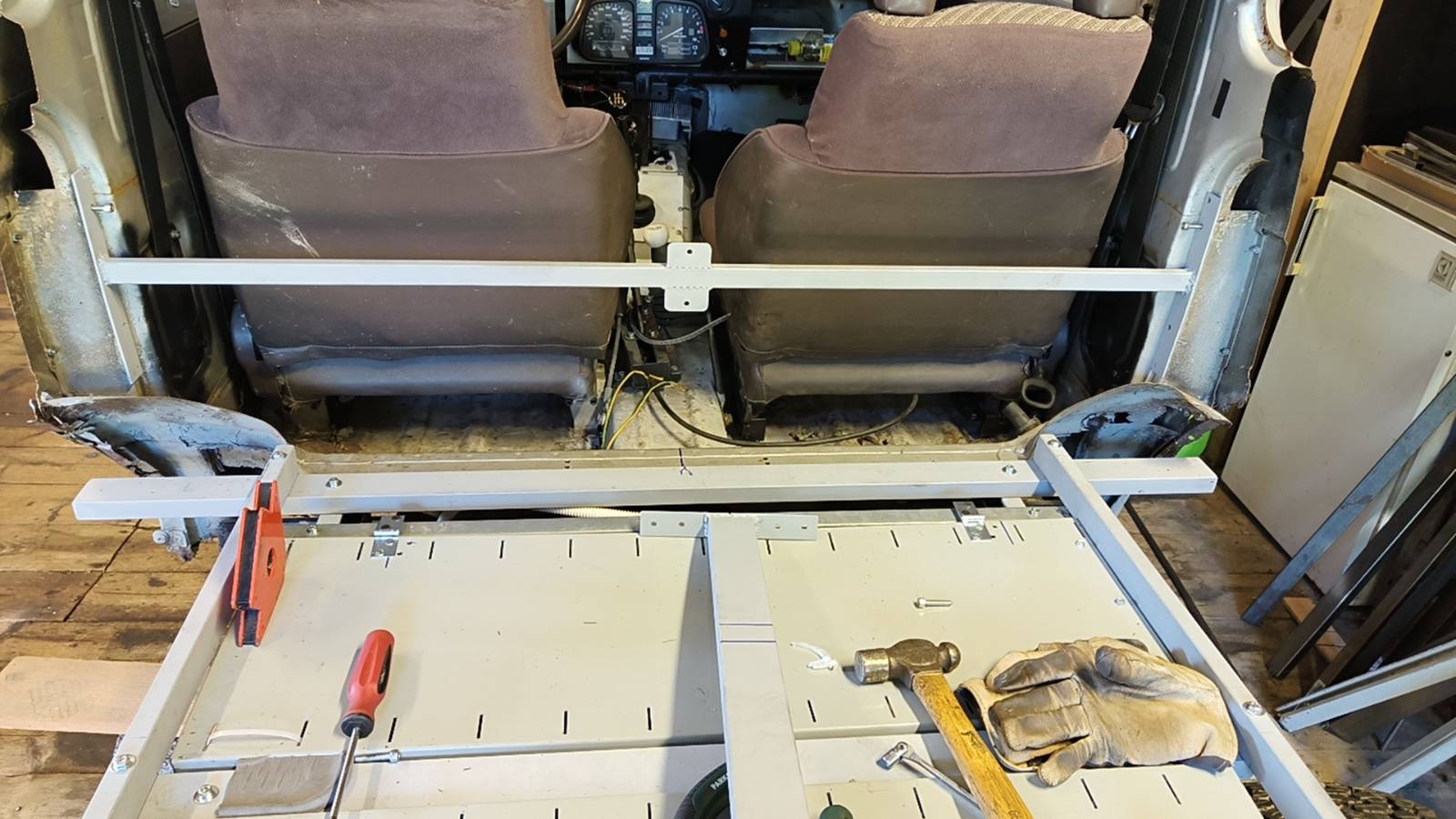 Pienet korotuspalat jotta iskarin kiinikkeiden kanssa ei joudu kikkailemaan. Etummaiset kiinikkeet piti nostaa rungosta joku 100mm. Muuten ratkaisuksi onneksi (selviää myöhemmin miksi) muodostui lavan kasaaminen niittimuttereilla.