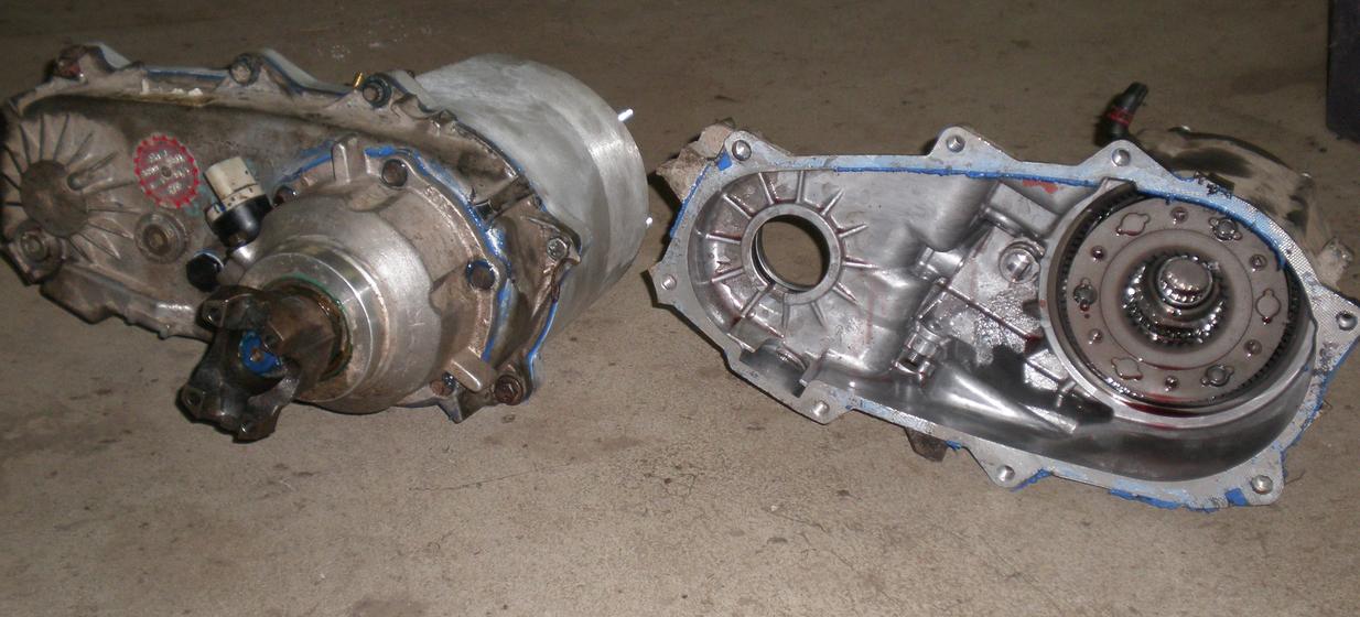 Sitten jakolaatikko uusine osineen. Välitykset on nyt 4.0. Uusi kuori on paljon paksumpi kuin vanha. Uudessa planettavaihteessa on 5 ratasta, kun originaalissa on 3. Jakolaatikossa alle puolet originaaliosia. Pääakseli on vaihdettu vahvempaan "slip yoke" kitin asennuksen yhteydessä ja nyt koko planeettavaihteisto. Kuorista vain keskimmäinen on originaali.