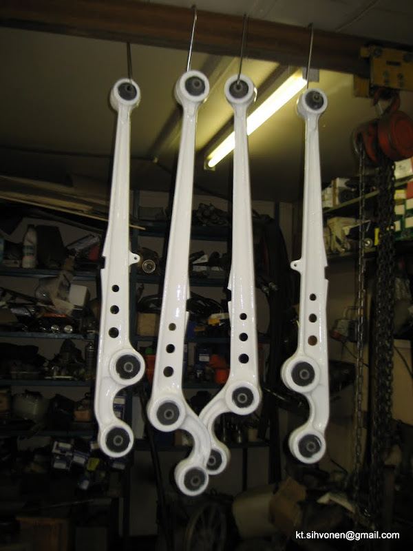 Tukivarret kävi hiekkapuhalluksen kautta ja sai värin pintaan Akseliputket saman käsittelyn jälkeen Navat niputettu, saaneet levyjarrut hidastamaan liiallista menoa Jakkarat valmiina, ainoastaan kuskit puuttuu ![]() Siin vähäksi aikaa ihmeteltävää, katotaan jos myöhemmin illal sais viel muutaman kuvan laitetuksi...
