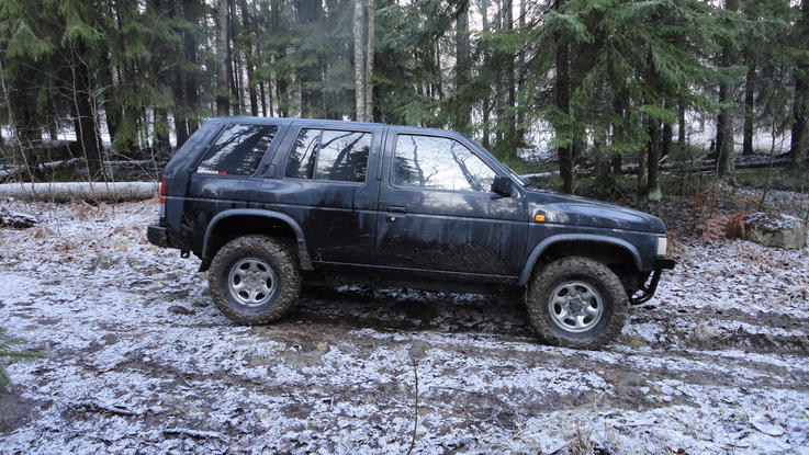 Eli tällä hetkellä alla 31" renkaat. Myöhemmiin tulossa 33" renkaat, kunhan saan jostaki ostettua korjausoppaan jolla sitten saa isommat rekisteriotteeseen. Koria nostettu 75mm. Ja taakse on tulossa +75mm korottavat jouset joulun jälkeen. Viime viikolla askartelin myös tukevamman etupuskurin, 4mm U palkista. Takapuskuri täytyy laittaa sit keväällä kun kelit lämpenee taas.