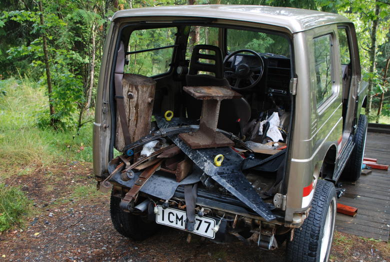 Project: Muzin SuizaJees, eli sairaus leviää, eiku ![]() Mutsi osti viime vuoden lopulla Samurain ja sitä pitää sitten myös tässä oman auton laittelun ohella tuunailla. Autolla näyttäisi olevan ajettu vain 60 000km ja kuntokin on sen mukainen, eli helvetin hyvässä kunnossa kaikki paikat. Tehtyjä muutoksia: - Jumputus stereot (Ripax freebie)+ Bilteman penkin alle sopiva subbari - 3" korottava alusta - 31" renkaat ja tarvittavat lokasuojien avarrukset - J0hannes Design CAD Puskuri Evo 1.0® - Uudet penkit jostain sopivasta lotjasta - 2" putkisto ja Calminin pakosarja - Bushwackerin 4.75" levikkeet - Kestomagneettimoottorilla oleva vinssi mahdollisesti höystettynä Säätäjä_setän teknologialla - 4.9 välitykset Tulossa muutoksia: - perien suojukset -jakolaatikolle panssari -J0hannes Design CAD Tankin panssari Evo 1.0® - Ym ym... Ja ainahan sitä pitää aloittaa tärkeimmästä ensin eli öljynvaihdosta ![]() Seuraavaksi tärkein tietenkin Stereot! Päätin veistellä uudet takapahvit 9mm vanerista, jotta julmetun kokoset ämyrit saadaan paikoilleen. Vanhoista takapaffeista tussilla hahmotelmat 9mm vaneriiin ja muutama vedos kaiuttimen kehyksestä. Sahailua Uutta ja vanhaa, on pientä kokoeroa havaittavissa:P Valmis tuote, tulihan muuten aivan helvetin hienot! Vanerikorokkeiden ja keinonahkan välissä on uretaanivaahtoa, jotta muoto säilyy.Laitan vielä huomenna kuvia, kun pahvit on autoon istutettuna. Tästäkin autosta varmaan ilmestyy sitten mun sivuille omat stoorit.