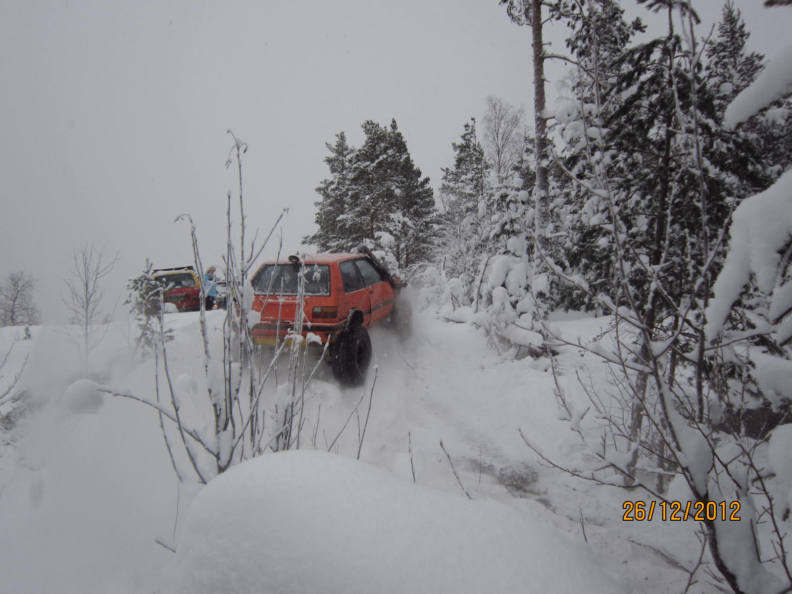 Joo oksennuksesta hajosi jarrut ja ohjausiskari. Onneks Elolla oli makkaraa ja karkkia niin pysyi innostus yllä. Kai meitä neljä autoa oli.