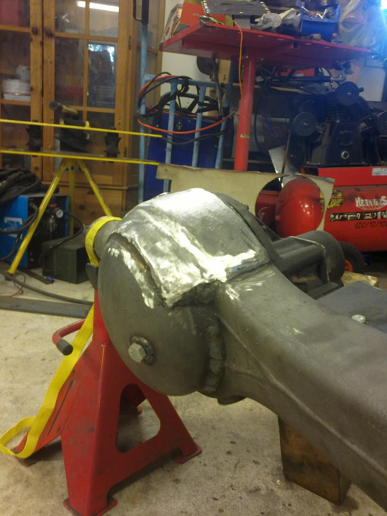 eli mutteri hitsattu sopivaan reikään ja pultti katkottu sopivan mittaseks + kupariprikka tiivisteeks: Sitten nappasin vanhasta peränkuoresta propun uusiokäyttöön, samoten G mersun takapanhardin toisen pään, porasin perän alapuolelle reiän ja hitsasin kahtapuolta 'putken' banjoon ja vanha proppu sen sisälle suojaan. Nyt ois taas tyhjennysproppukin mistä saa ainakin enimmät peräöljyt ulos. Saumasta tuli kyllä paljon tasasempi kuin mitä kuva näyttää ja hitsattu molemmin puolin joten luulis että pitää... Viimisenä tuli tekastua tuosta takaperän pinionin laipasta ns. double drilled version eli nyt siitä löytyy oikea jako myös tuolle sovitinlaipalle.Ens viikolla jos kävis vaihtamassa migin pullon täyteen niin vois hitsata tuon putkipäädyn paikoilleen ja pääsis miettimään alapuolen panssaria/materiaalin lisäystä että kestää hieroa eikä mee puhki ihan heti... Viimeksi muokannut mparty : 20.04.2013 18:21 |
