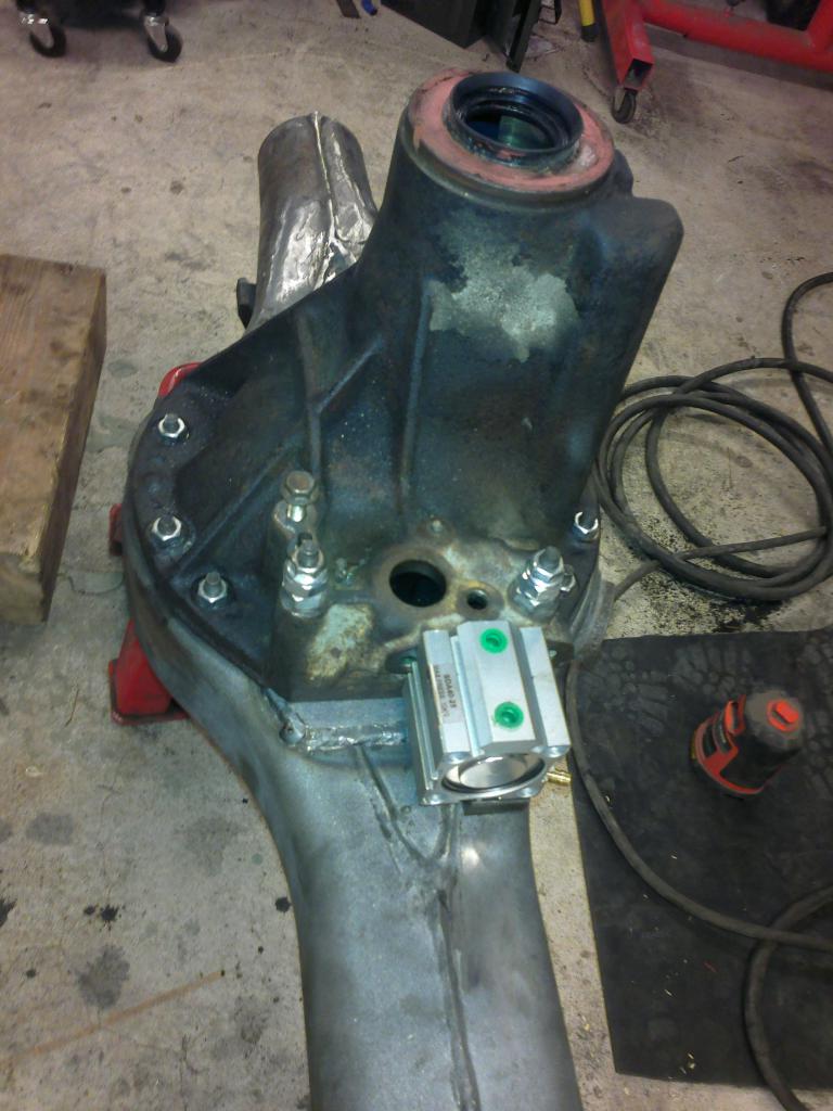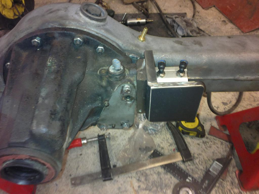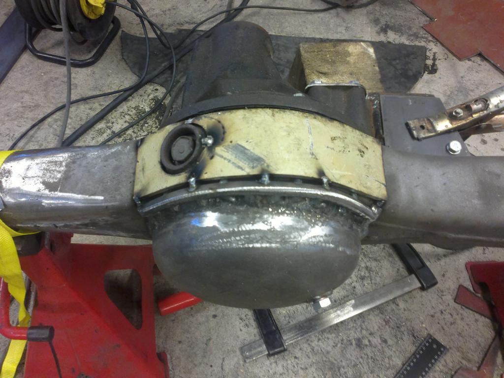 eli mutteri hitsattu sopivaan reikään ja pultti katkottu sopivan mittaseks + kupariprikka tiivisteeks: Sitten nappasin vanhasta peränkuoresta propun uusiokäyttöön, samoten G mersun takapanhardin toisen pään, porasin perän alapuolelle reiän ja hitsasin kahtapuolta 'putken' banjoon ja vanha proppu sen sisälle suojaan. Nyt ois taas tyhjennysproppukin mistä saa ainakin enimmät peräöljyt ulos. Saumasta tuli kyllä paljon tasasempi kuin mitä kuva näyttää ja hitsattu molemmin puolin joten luulis että pitää... Viimisenä tuli tekastua tuosta takaperän pinionin laipasta ns. double drilled version eli nyt siitä löytyy oikea jako myös tuolle sovitinlaipalle.Ens viikolla jos kävis vaihtamassa migin pullon täyteen niin vois hitsata tuon putkipäädyn paikoilleen ja pääsis miettimään alapuolen panssaria/materiaalin lisäystä että kestää hieroa eikä mee puhki ihan heti... Viimeksi muokannut mparty : 20.04.2013 18:21 |