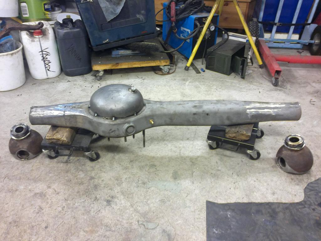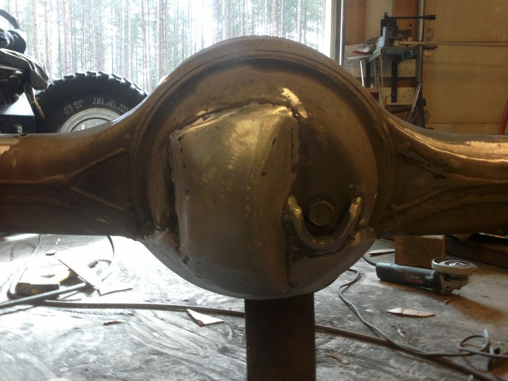 eli mutteri hitsattu sopivaan reikään ja pultti katkottu sopivan mittaseks + kupariprikka tiivisteeks: Sitten nappasin vanhasta peränkuoresta propun uusiokäyttöön, samoten G mersun takapanhardin toisen pään, porasin perän alapuolelle reiän ja hitsasin kahtapuolta 'putken' banjoon ja vanha proppu sen sisälle suojaan. Nyt ois taas tyhjennysproppukin mistä saa ainakin enimmät peräöljyt ulos. Saumasta tuli kyllä paljon tasasempi kuin mitä kuva näyttää ja hitsattu molemmin puolin joten luulis että pitää... Viimisenä tuli tekastua tuosta takaperän pinionin laipasta ns. double drilled version eli nyt siitä löytyy oikea jako myös tuolle sovitinlaipalle.Ens viikolla jos kävis vaihtamassa migin pullon täyteen niin vois hitsata tuon putkipäädyn paikoilleen ja pääsis miettimään alapuolen panssaria/materiaalin lisäystä että kestää hieroa eikä mee puhki ihan heti... Viimeksi muokannut mparty : 20.04.2013 18:21 |
