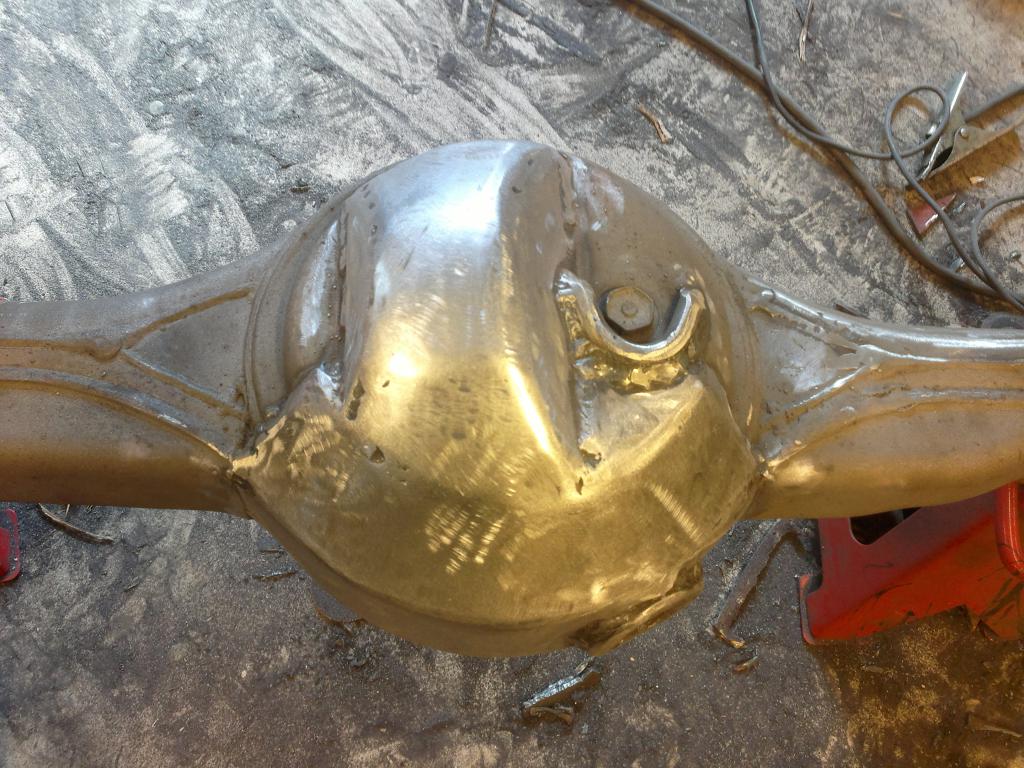 eli mutteri hitsattu sopivaan reikään ja pultti katkottu sopivan mittaseks + kupariprikka tiivisteeks: Sitten nappasin vanhasta peränkuoresta propun uusiokäyttöön, samoten G mersun takapanhardin toisen pään, porasin perän alapuolelle reiän ja hitsasin kahtapuolta 'putken' banjoon ja vanha proppu sen sisälle suojaan. Nyt ois taas tyhjennysproppukin mistä saa ainakin enimmät peräöljyt ulos. Saumasta tuli kyllä paljon tasasempi kuin mitä kuva näyttää ja hitsattu molemmin puolin joten luulis että pitää... Viimisenä tuli tekastua tuosta takaperän pinionin laipasta ns. double drilled version eli nyt siitä löytyy oikea jako myös tuolle sovitinlaipalle.Ens viikolla jos kävis vaihtamassa migin pullon täyteen niin vois hitsata tuon putkipäädyn paikoilleen ja pääsis miettimään alapuolen panssaria/materiaalin lisäystä että kestää hieroa eikä mee puhki ihan heti... Viimeksi muokannut mparty : 20.04.2013 18:21 |