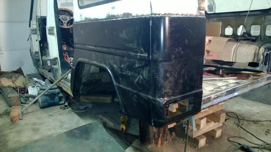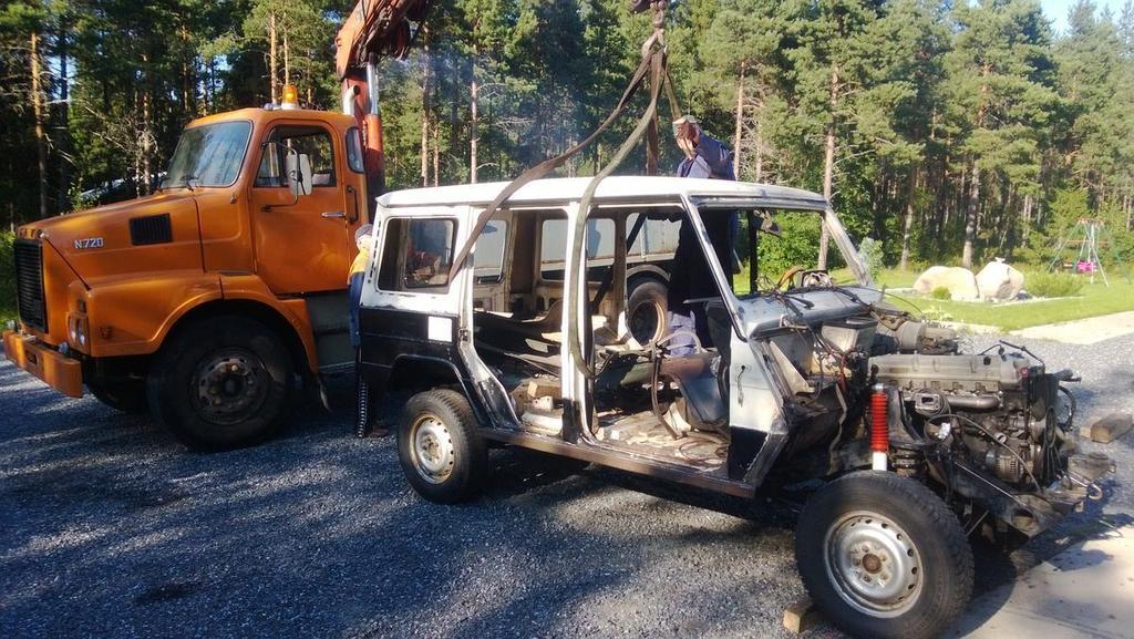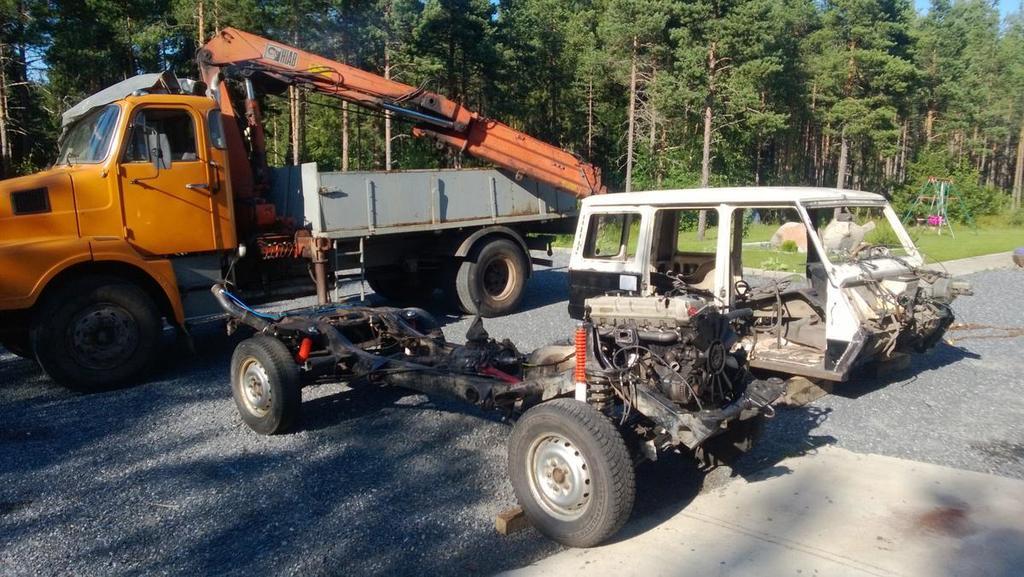 Kun runko oli saatu valmiiksi oli aika yhdistää kaksi puolikasta takaisin. Apuun tuli naapurissa asuva isoisä joka useamman kymmenen vuoden hiab kokemuksella nosti kopan nätisti paikoilleen. Nyt ei tarvitse tekniikkaakaan enään arvailla eli keulille tulee om606 herlevin 7mm pumpulla sekä 722.6 sähkölaatikolla. Kuvissa näkyy myös saksasta halvalla tilatut wolfin etulokasuojat.