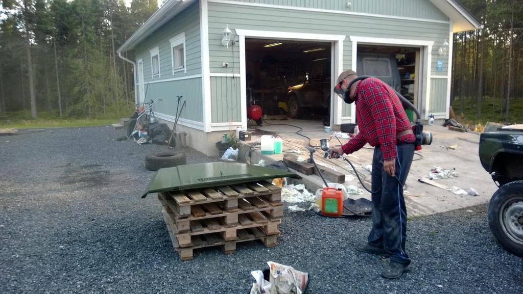 Seuraavaksi oli vuorossa äänieristys josta ei näköjään kuvia tullut otettukaan, mutta bitumia tuli pohjaan sekä oviin useampi neliö. Sitten alkoikin hiontahommat joissa pääperiaate oli että suoraa ei saa kuitenkaan niin tehdään niin kauan ku miehellä pää kestää. Pari pakkeloitikertaa se sitten kesti ja eikun maalit niskaan. Viimeisessä kuvassa onkin pirssi nykykuosissa odottamassa sisustan laittoa. Maalina temadur 20 ja värikoodi RAL 6031