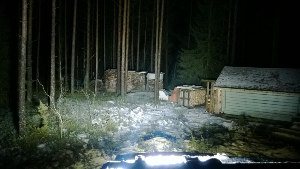 Kuskin puolen led bar päällä, aika tasasen näkönen valo ja suht leveä: Kuskin puolen led bar päällä, Jeeppi kuorkin vieressä: Molemmat led barit päällä: En tiiä selviääkö noista mitään? |