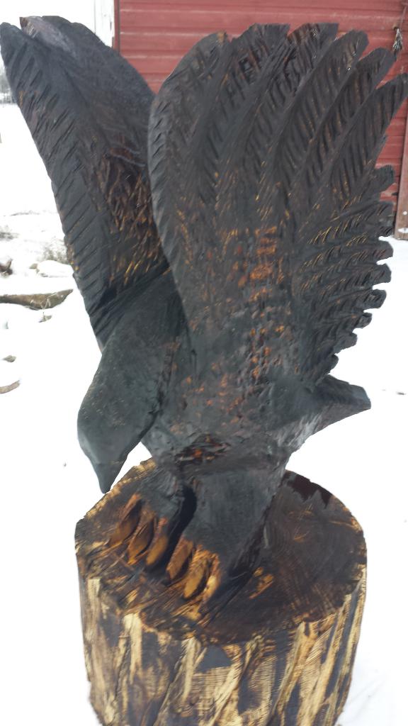 Miulla on noita nalle aihioita tuossa pihalla nyt reipas kolmekymmentä pölkkyä ja pituudet vaihtelee kahdesta neljään metriin. Suurin osa kuusta ja mäntyä, joukkoon on eksynyt jokunen tammikin. Pienin halkaisia on 45cm ja suurimmat metrin luokkaa Enää ei puutu kuin sopivat kelit ja motivaatio alkaa sahaamaan. Kaikista ei välttämättä tule nalleja kun muutakin on tilattu/pyydetty tekemään. Harjoitus kotkasta kuva liitteeksi, on siis eka isompi lintu mitä olen tehnyt.