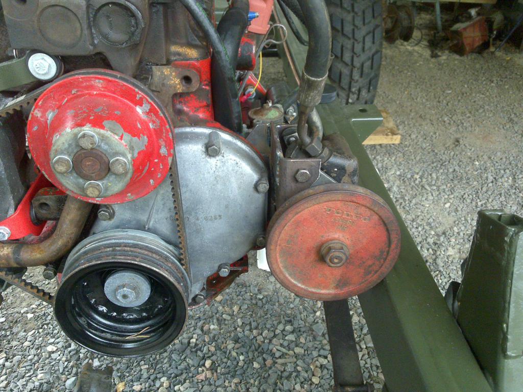 Pumppu asemoitui rungon ja moottorin väliin, tilaa ei ollut yhtään liikaa. Hihnapyörään hitsasin jonkun toisen volvon muokatun hihnapyörän, tuli riittävän hyvä ihan silmämääräsellä kohdistuksella. Pumpun kiinnikkeet omaa käsialaa, kiristysmekanismista ei ole kuvaa mutta se tehtiin vain pultista ja kiristysmutterista.