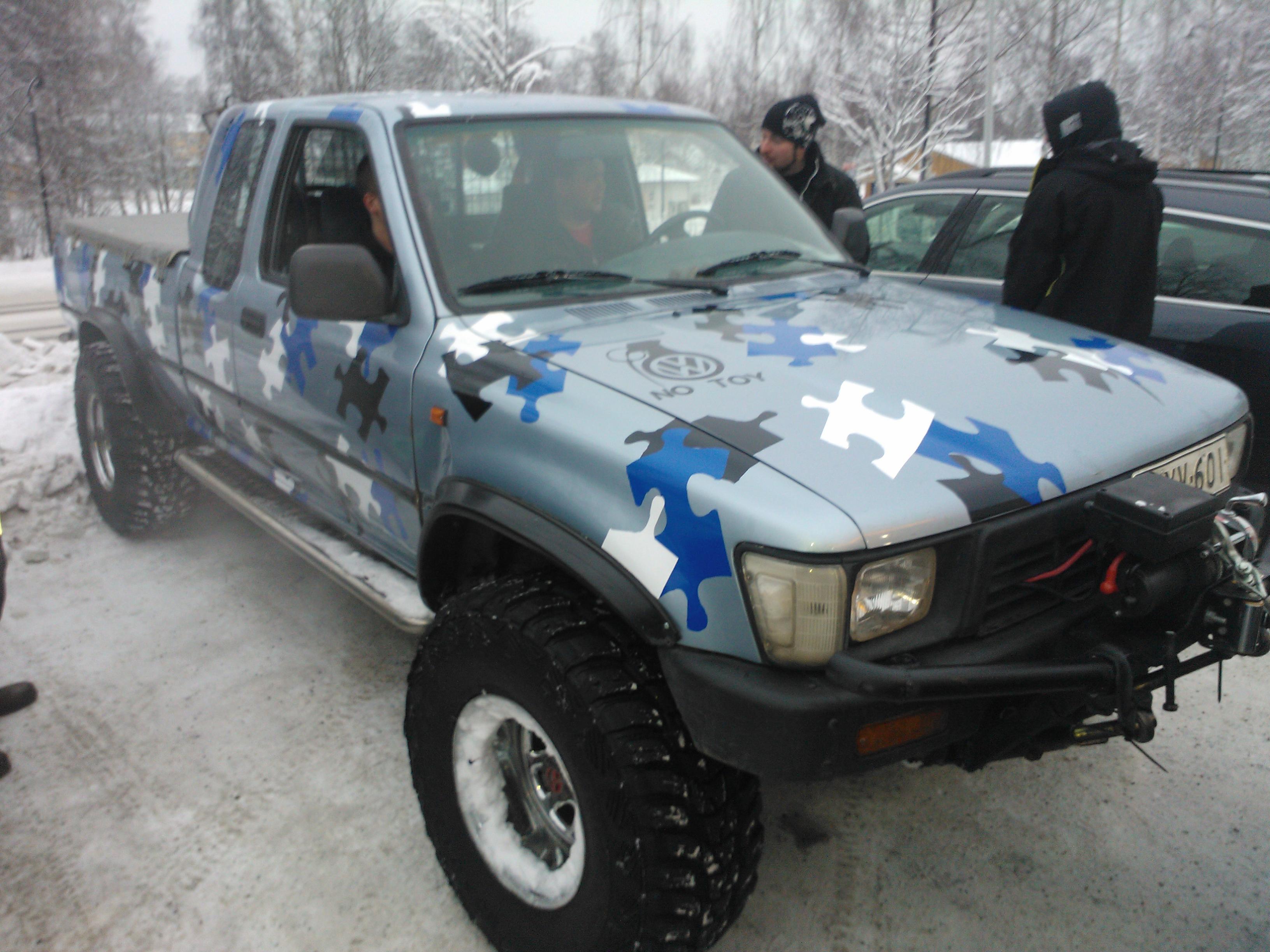 Tuossa tuo mun auto. Maalit menee tän kevään aikana uusiksi kun huonot pohjatyöt noissa. Tuo vanerilava vaihtui oikeaksi, ja siihen tuli kunnon lavakaarta, helmaputkea, safaritelinettä ja karjapuskinta, ja ne maalataan kans camoksi.