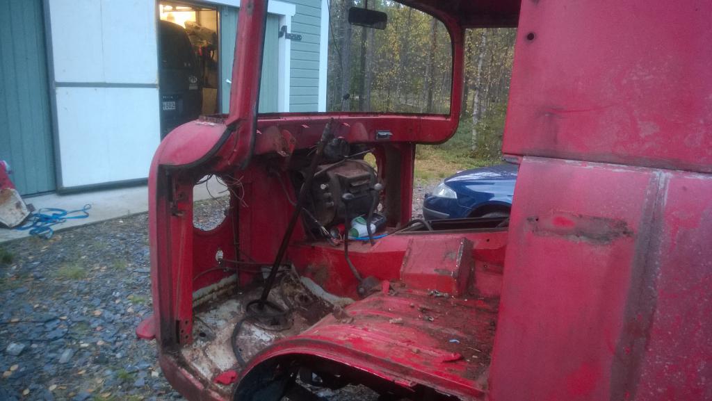 ja tuskin tulee takas, pitää kattoa tekeekö tuohon nyt palkki- vai putkipuskurin sitten joskus. Konehuone näyttää ihan mielenkiintoiselta, kunhan saa korin pois päältä niin pääsee paremmin näkemään mitä tuolta löytyy: Jonkun verran ehti sisältä purkaa, huomenna varmaankin jatkuu kunhan saa muut hommat pois alta. Tuli myös tarkistettua etuperän lukon olemassa olo eli tunkkasin akselin ilmaan ja pyörittelin renkaita, pyörii eri suuntiin eli ei käynyt tuuri, ei ollu valittu etulukkoa optioista tähän jeeppiin. Nyt kun nämä akselit ei jää pitkällä juoksulla alle pitäs päättää laittaako minkä lukon tuohon etuakselille... Lock right tms. olis budjettiratkaisu, mutta katotaan nyt. |