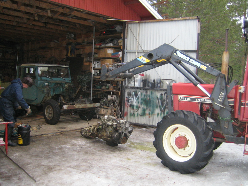 Ensimmäisenä purin loput keulan pellit jotka lähtivät melko nätisti irti. Muistaakseni pultteja löysätessä vain kaksi pulttia meni poikki ja se on minusta pienoinen ihme, kun kyseessä on vanha Toyota jotka yleensä murenevat tallin lattialle jo pelkästä tuimasta katseesta. Seuraavaksi irrottelin akkutelineen ja syylärin jotta tekniikka olisi helppo nostaa pakettina pois rungolta. Olihan siellä muutakin pientä hilpettä mitä piti irrotella, mutta kohtuu yksinkertainenhan tämmöinen on hajottaa osiin. Tekniikka oli kevyt nostaa rattorilla pois ja kettinkitalja oli oiva keksintö moottorin ja nostolaitteen välissä. Taljalla oli turvallinen tehdä pieniä liikkeitä ja heti hoksas jos joku paikka oli kiinni tai muuten tiukilla. Isäntä oli myös mukana kun tekniikkaa nostettin pois keulilta.