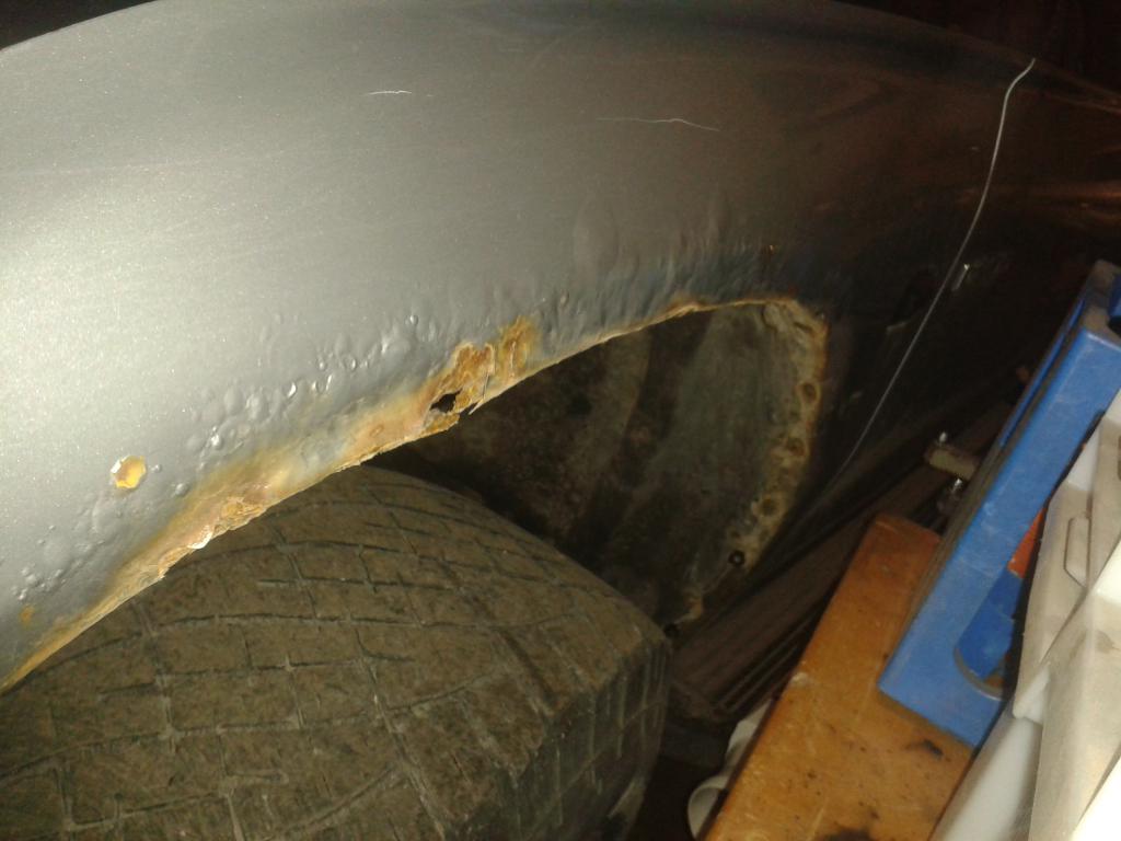 Noh olisi siitä kauniimpikin voinut tulla... Nuo näkyvät rosot ja epätasaisuudet piti täyttää fillerillä mutta eihän se vanha tölkki riittänytkään n.1mm kolojen täyttöön joten jäi täyttymättä... tässä vaiheessa oli jo päätetty että muoto ei miellyttänyt omaa silmää sinnepäinkään vaikkei tästä mitään näyttely peliä rakennetakkaan.. joten todettiin että ostetaan tällekkin puolelle se uusipelti ennenkuin viedään kesällä kunnolla maalaukseen nyt kun ei paikkaa ollut missä ruiskulla olisi voinut leikkiä niin jouduttiin tyytymään kilikoli versioihin. Täytyypä vielä sanoa että tuo mastonin vannehopea osui pelottavan lähelle oikeaa sävyä olisikohan günther aikanaan jo vaihtanut originaali maalin hyllyn halvimpaan, se selittäisi myös järkyttävän paksun maali kerroksen ympäri autoa. Tosiaan ensikesänä on tarkoitus vetää pinnat oikeaan uskoonsa ja maalata 2K maaleilla koko romu. No seuraavana otettiin työn alle saman kyljen taka lokari tässä ei hitsiä tarvittu laisinkaan vaan oli pelkässä pinta ruosteessa kevyt siistiminen ja ruosteen pysäyttäjää tännekkin siihen pakkelit ja maali "häivytys" eli vapaalla kädellä pienessä tinnerihöyryssä