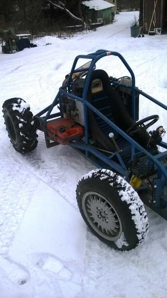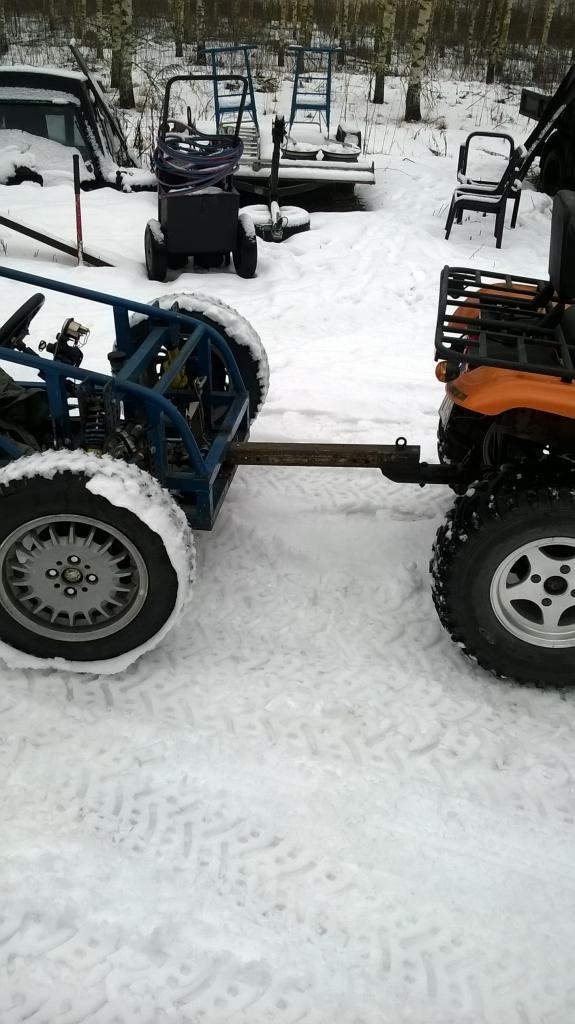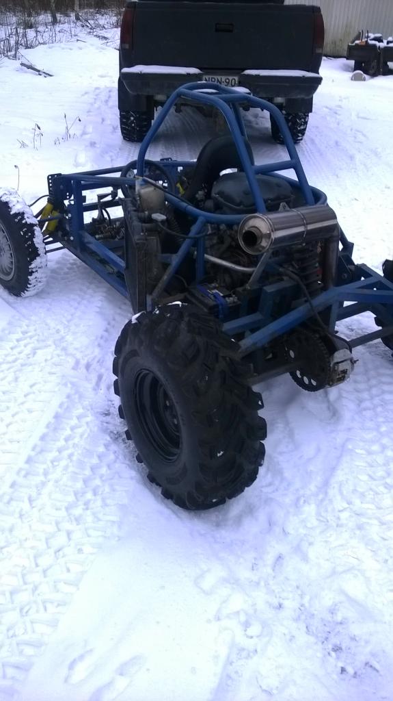 Putkirunko Ninja moottorillaEihän tuo nyt varsinainen maasturi ole mutta mönkijän takarenkailla kuitenkin Moottorina Kawasaki 900 kuutioinen moottoripyörän moottori, tehoa 140 heppaa ja painoa noin 350 kg eli rapa lentää aika hyvin! Pari ongelmaa löytyy: liian isot vaihteet ja pakkia ei ole ollenkaan. Täytyis sovittaa joku moottorikelkan vaihteisto jossa on alennusta. Tai sitten sähkövinssistä sähköpakki. Nykyisin siirrellään mönkijän koukkuun sovitetulla irtopuomilla. Alustassa on säädöt korkeudelle ja jäykkyydelle. Etupäässä saisi olla enempi joustovaraa eli pidemmät iskarit/jouset. Asvaltille ja jäälle tämä on alun perin rakennettu, mutta on se mukava repiä pellollakin