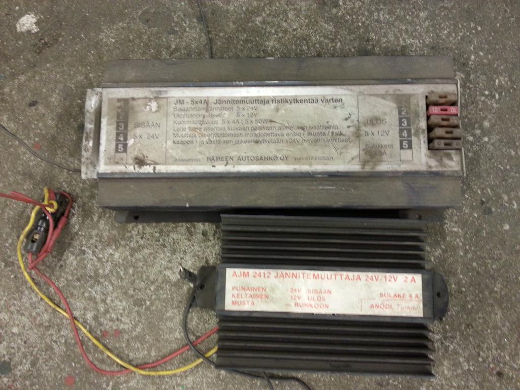 Jännitteen alentimia 2kpl 24->12v olleet kauan hyllyssä. Vaikka yht 20e?