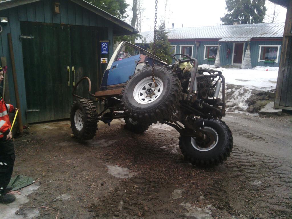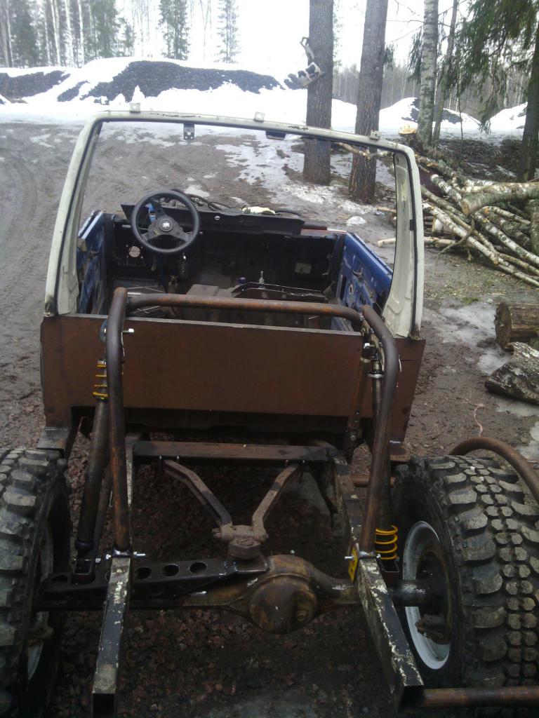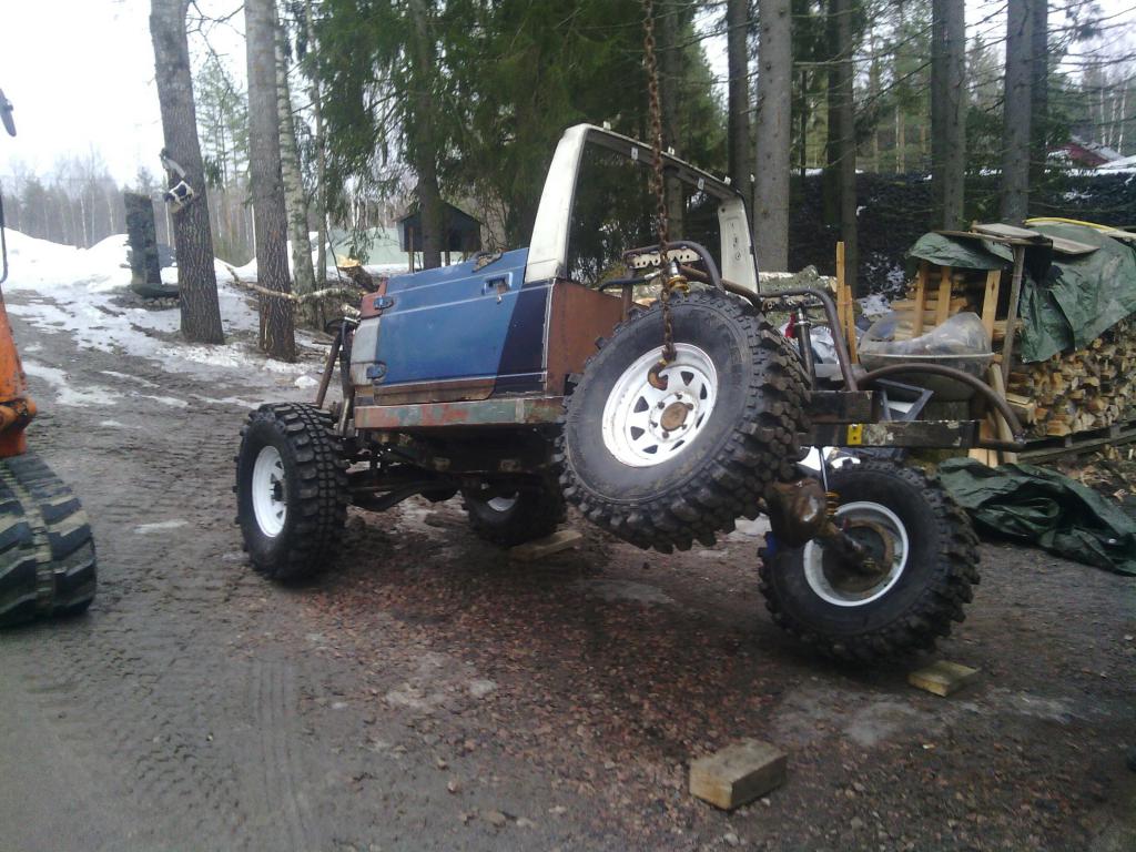 Joitain osasia löyty pihan nurkista ja jotain tullu hommailtua, lj:n akselit, ziarelli 35\12,5-15 renkaat ja motivaatio löytyi eteläsuomen peränostoretkeltä. 110cm pitkät bilsteinin coiloveritkin ilmesty matkahuoltoon. Lj:n etujakarit asemoitiin eteen ja lisättiinpä sinne akselin yläpuolelle yks tukivarsi lisääkin. Taakse viskattiin rangen kolmilinkki. Coilien kaveriksi asemoidaan vielä profenderin 4" bumpstopit. Renkailleen saatiin ni kiireesti pihalle vähän venyttelemään. Ihan kohtalaisestihan tuo veny noinkii kevyessä varustuksessa. Edestä metrinverran ja takanta parkytsenttiä vähempi. Viimeksi muokannut turakoitsija : 06.03.2015 11:47 |