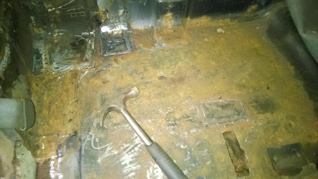 Vappu hulinoiden lomassa (kankkusta potiessa) kerkes taas hieman hitsaileen tätäkin. Lähtötilanne apukuskin puolella: Vähän oli vanhat paikat takakulmissa ottanut väriä pintaan. Oli päässyt vedet makaan tuolla lattialla talviunien aikana kun oli ovi päästänyt sadevedet sisälle... Mitään pehmeetä ei onneks löytyny sieltä vanhojen paikkojen suunnalta