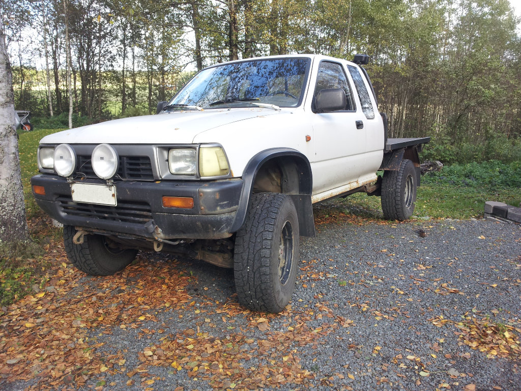 Vuosimalli 1989. Mittarissa noin 560000. Helmoissa palkit. Paikkailtu ja maalattu kolme-neljä vuotta sitten. Flatbed käy suoraan Hiluxin vakiokiinnityksiin. Koria nostettu rungolta 50mm. Renkaat Nokia Rotiiva 31x10.5x15, joissa pintaa edessä 60% takana 40%. Etuset vaihdettu taakse viime kesänä suuntauksen jälkeen. 2000kg kärrin saa laittaa perään.