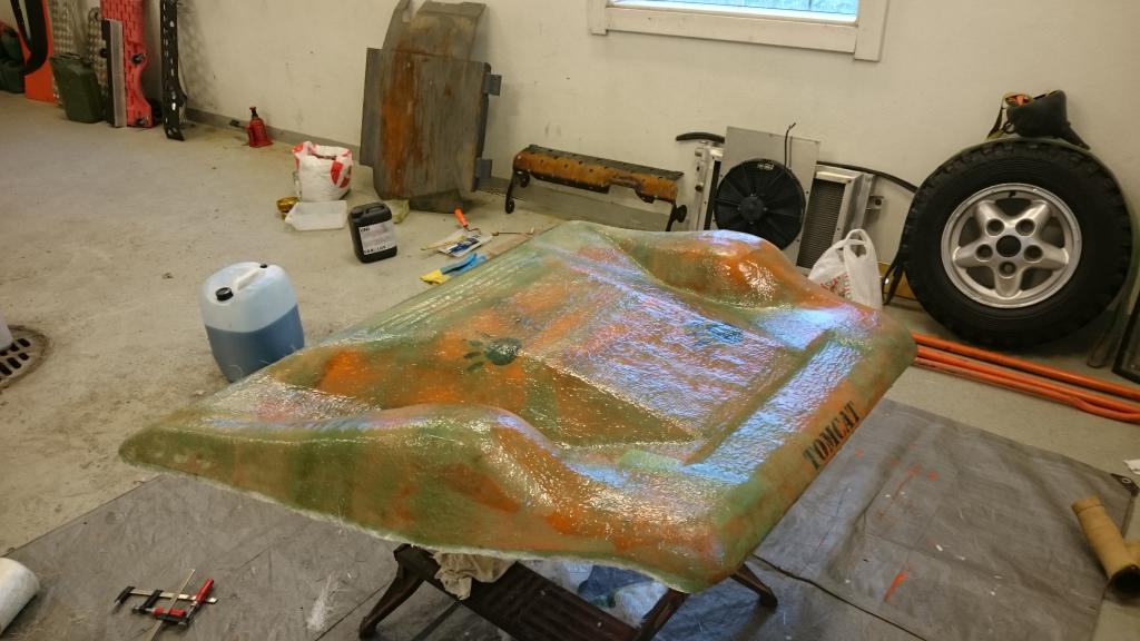 Otin kopion tosta konepellistä (siis lasikuidusta), on toi pinta halkeillut joka puolelta (oisko tällä päästy entisessä elämässä samppaniaa ruiskiin konepellillä, vai mikä lie rikkonu) niin päätin tehdä uuden. Kuvassa ois se alkuperäinen, siitä tehty muotti, ja sit se uusi konepeitto. Vähän hiontaa ja reunojen leikkausta ja sit väriä pintaan.