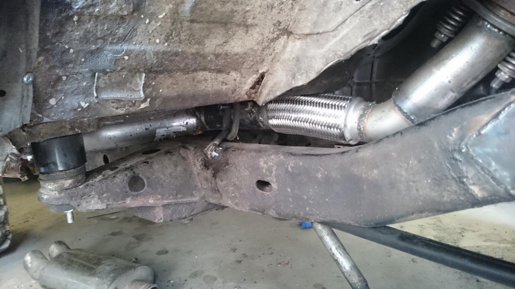 Ei miellyttänyt ensimmäinen versio putkesta niin, hain tänään oikeen kaupasta jousto pätkän ja hitsailin käyrät uuteen malliin. On ainakin vinssi kardaanille tilaa vaikka onki lähöstä saakka paksummalla putkella. Ylimääräisen jousto osan takia sai putken vietyä rungon ja korin välistä suojaisessa paikassa, niin tiukka väli että "jäykällä" putkella olisi resonoinut johonki. kolmen tuuman rosteri putkella menee taakse jonka päähän hitsattu 60mm laakerinkooli ja mutka. Just sopivasti vaimentaa 15mm kuristus putken päässä.