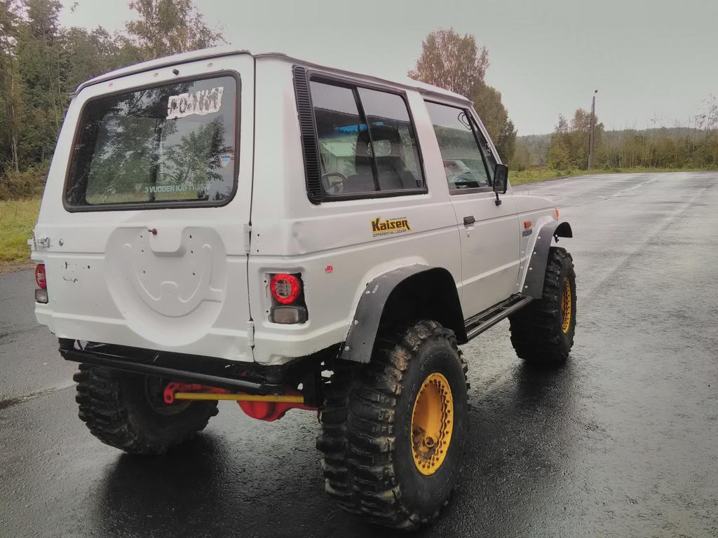 Samurailla ajellu pari päivää ja kaikinpuolin tuntus toimivan. Kovin homma oli pestä auto. Harmaa pinttynyt lika oli uskomattoman tiukassa mutta luovutti viimein homeen pesuaineella. Konetila on erittäin siisti, täysin alkuperäisessä kunnossa kaikki. Takaloosterista heitin penkit pois Ku ei siellä kukaan kuitenkaan mahdu istumaan. Pako putki vuoti, sen hitsasin kuntoon ja vaihdoin yhden kannakkeen. Leimaa on vuosi joten ei muuta kun kovaa ajoa. Mätää on siellä Täällä mut ei erityisen paha vielä. Jos tätä rassailis talvella johonkin malliin. Hitsi hommat, tehostin, välitykset, Vinssi (mekaaninen)? Ja soa korotus esimerkiksi. Otteessa 205/70r15 rengas koko, eli 31/10,5 rengas otteeseen?.