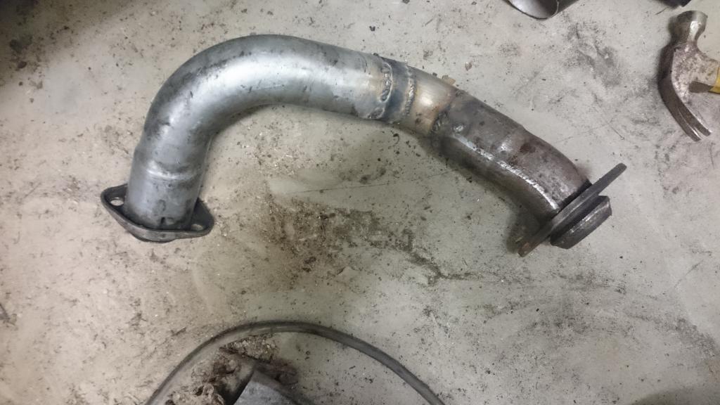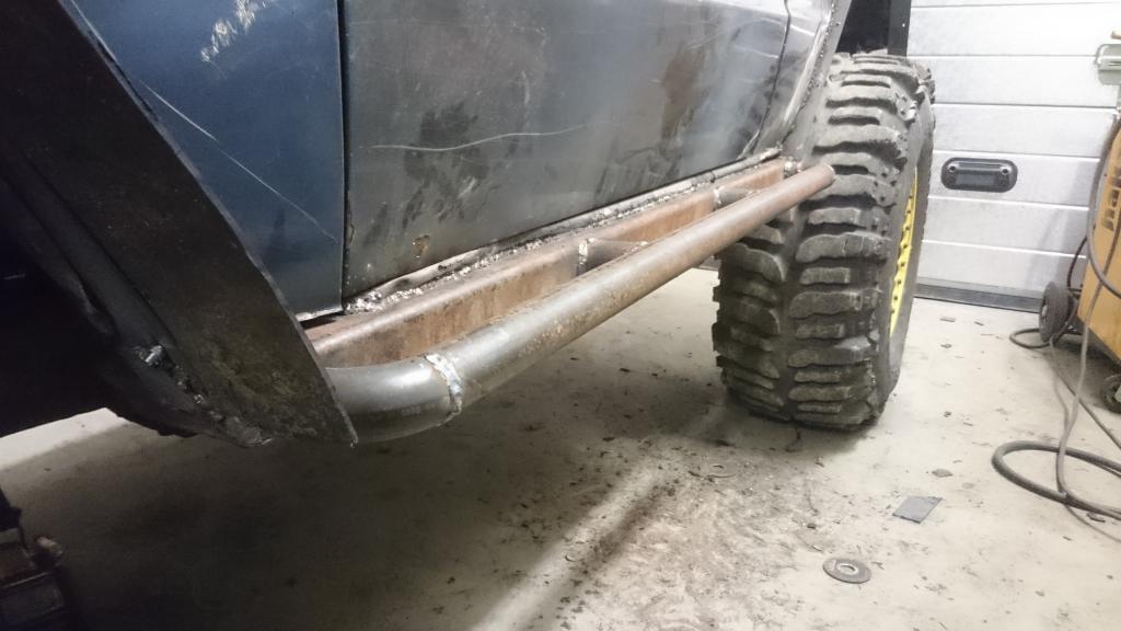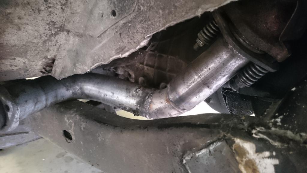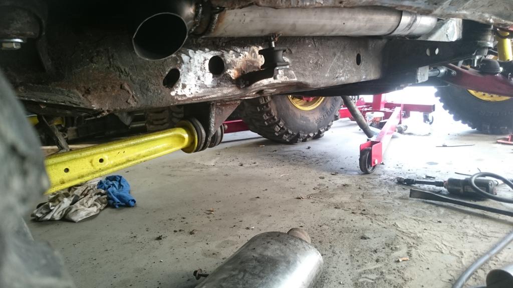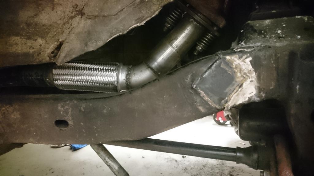 Ei miellyttänyt ensimmäinen versio putkesta niin, hain tänään oikeen kaupasta jousto pätkän ja hitsailin käyrät uuteen malliin. On ainakin vinssi kardaanille tilaa vaikka onki lähöstä saakka paksummalla putkella. Ylimääräisen jousto osan takia sai putken vietyä rungon ja korin välistä suojaisessa paikassa, niin tiukka väli että "jäykällä" putkella olisi resonoinut johonki. kolmen tuuman rosteri putkella menee taakse jonka päähän hitsattu 60mm laakerinkooli ja mutka. Just sopivasti vaimentaa 15mm kuristus putken päässä.