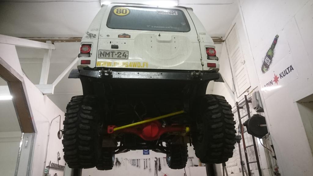 Topiccia kun selaa taakse päin niin jotain kuvia löytyy akseli jumpasta. Keula ja noin 120cm runkoa on pitkästä super select -92 pajerosta, ei abs jarruja. Vetarin vapautus mekanismi lukittu kiinni asentoon. Kiinteiden laippojen tilalle napalukot. Kakkos Korisen Apusimpukka kestää ihan toiseen tyyliin kun vanhempi versio. Ohjaus simpukka on 1korisesta, joutu yhden reijän poraa lisää niin kävi paikoilleen. Vääntösauvat pitkästä, ne on hyvät, pienellä esijännityksellä pysyy keula ylhäällä mutta joustaa kuitenkin sisään. Paremmat kun ohuet sauva jouset. Ei leimalla mitään brobleema, Gr patrollin orkkis vanteet oli vielä niin renkaat oli sisemmässä kuin alunperin.