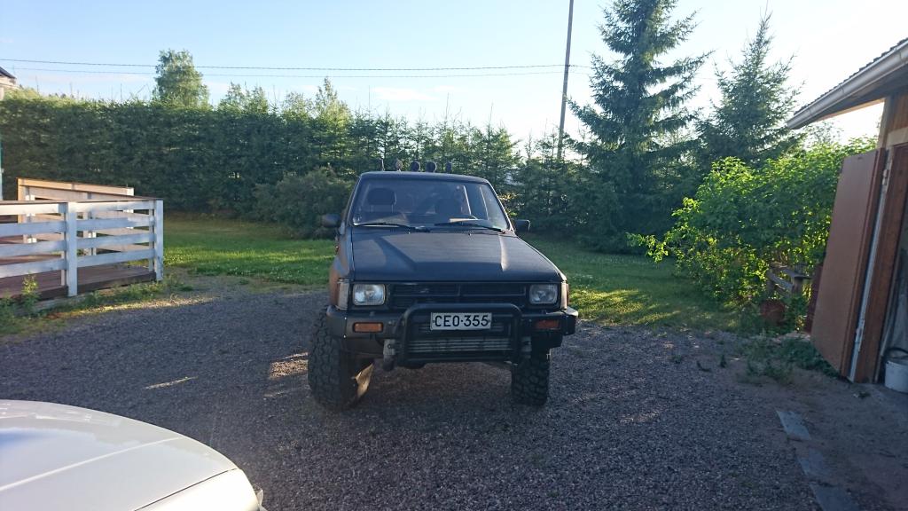 Tänään taas kerkes hetken mylläämään tojon kimpussa. Tarvii välillä nyppiä tota pahaa volkkaria leimaus kuntoon, mut ny ois valot ja lokarit paikassaan ja lavarauta. Samalla pistelin nua sidontalenkit. Ny ei si kai muuta enää ku roiskeläpät tars nakerrella ja pikkasen lisä tukee lokareille. Sit viä dieselin täyttöputki, ku vanha on sen näkönen, et joku ois reenannu haulikko ammuntaa