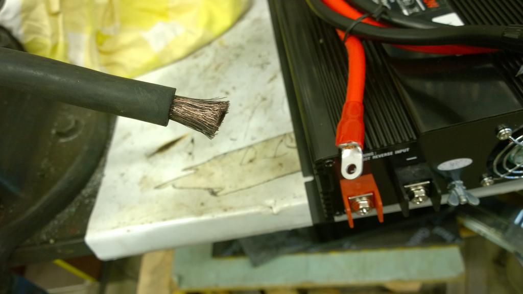 1500W invertteri kiskoo 12V:lla 125A eli ihan melko paljon. Kaapelin poikkipinta 35mm2 olisi juuri rajoilla jos ei koko ajan luukuta täysillä. Kaipa 25mm2 vielä tulee jotain ulos, mutta alkaa kaapeleista muovit pehmenemään.