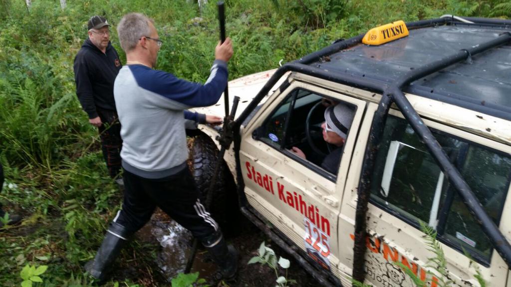 Odotettu "ilman takavinssiä ollaan kusessa" -tilannekin saatiin lopulta aikaiseksi ja jäätiin muitten armoille. Odoteltiin siinä jotain autoa saapuvaksi, että saataisiin perä nypättyä vähän sivulle. Olikohan Worry 51, jotka urheasti halusivat auttaa mönkijöillä. Saatiinkin perää hiukan siirtymään, mutta valitettavasti hajotettiin samalla vinssinaru mönkkäristä - kiitos ja anteeksi! Onneksi Temmitiimi - jota oltiin jo autettu aiemmin työkalulainalla - saapui paikalle ja veti meidän pois pinteestä. Samaisen tiimin kanssa oli pientä yhteistyötä jo eräällä aiemmallakin rastilla. Kiitos.