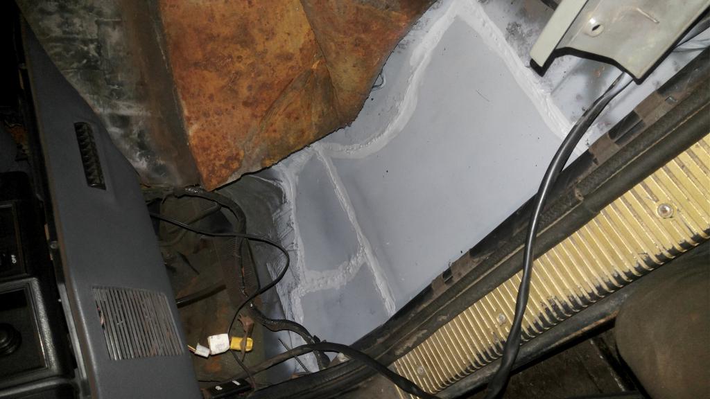 Kotiin päästiin ja auto nosturille. Ostohetken perusteellisessa tutkimuksessa jo havaitsin, että kynnyskoteloiden takapäissä on lievät reiät, joten ajattelin paikata ne ensimmäisenä. Poistettuani takaa muovikaaret lähti mukana myös jossain määrin peltikaaria. Tässä vaiheessa katsoin tarpeelliseksi vähän tökkiä Jeepin pohjaa meisselillä ja tuskanhiki alkoi puskea otsalohkosta lattialle, kun melkein joka tökkäyksellä tuli uusi reikä. Matto pois ja totuus valkeni... Melkein koko lattian laidat ja vähän muutakin pitää vaihtaa. No sitten vaihdetaan. Kuskin puolen etulattian vaihdoin kokonaan. Tässä vaiheessa tutustuin intterinnetistä korjauspaloihin, jotka Ameriikan Joen kaupassa äkikseltään näyttivät niin karmeilta, että palasin talliin kopistelemaan peltiä vasaralla. Poistin myös ovista nämä muovilärpäkkeet ja vänkärinpuolelta myös niihin jäi peltiä kiinni, joten myös ovet piti korjata.