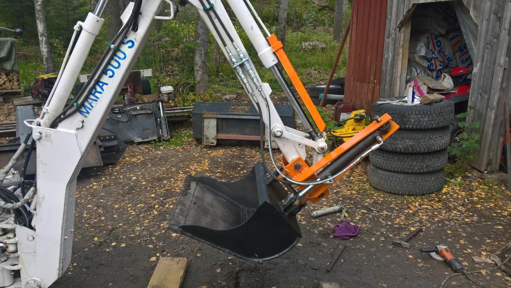 Marassa lisää hieman haastetta se että tuo "puomin pää" on 20 senttiä leveä versus minikaivurin 11.(?) Eli se lisää tarvittavaa sylkän pituutta Jonnii verran. Mittaa taas saisi pois tiputtamalla tuon kauhan puoleisen korvallisen niin alas kuin suinkin ja kallistamalla hieman sylinteriä. Sekä tietty tuohon varta vasten tehdyllä sylkällä mutta budjetti oli sen verran tiukka että jäävät seuraaviin versioihin...