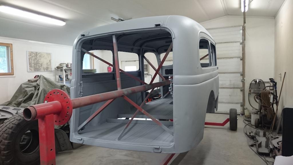Paljon tuli viime talven aikana hitsattua koria. Ja alkukesästä se puhallettiin. Nyt kori on epoksissa. Irtoosat on vielä maalattava, niistä löyty vielä puhalluksessa parsittavaa. Kauhea polte olisi päästä sovittamaan koria rungolle. Niin korin ja rungon väliin sovitin Ramin polyuretaani kumit. Alunperin ei ollut kummeja ollenkaan. Koitin modata kiinnikkeitä niin ettei kori nouse kuin 15mm. Pakko malttaa ja kuitenkin koittaa kitata katto ja maalata pohja pintamaaliin pyörittäjässä. Kuvia myös ovien uusista lukoista ja ovien sovituksesta. Yksi kuva myös sivulasien kehyksissä. Hiukan panssariajokki henkeä joku ruoja on tosiaan pillittänyt lasin aukon pyöristykset pois.